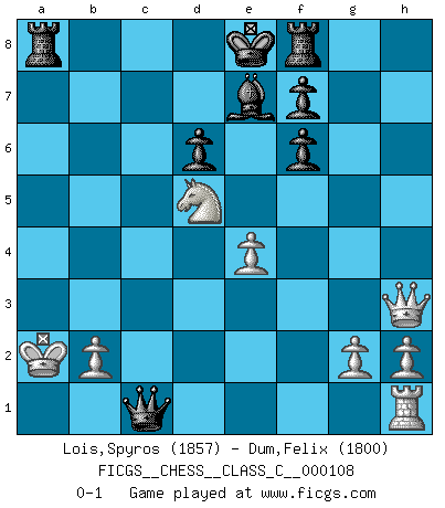 Last move : 0-1 2009 April 5 18:12:32 [Event "FICGS__CHESS__CLASS_C__000108"] [Site "FICGS"] [Date "2009.03.07"] [Round "1"] [White "Lois,Spyros"] [Black "Dum,Felix"] [Result "0-1"] [WhiteElo "1857"] [BlackElo "1800"] 1.e4 c5 2.Nf3 d6 3.d4 cxd4 4.Nxd4 Nf6 5.Nc3 a6 6.Bg5 e6 7.f4 Qb6 8.a3 Bd7 9.Nb3 Nc6 10.Qf3 Be7 11.O-O-O Qc7 12.Qd3 b5 13.Bxf6 gxf6 14.Qg3 b4 15.axb4 Nxb4 16.f5 Rc8 17.Kb1 a5 18.fxe6 Bxe6 19.Qg7 Rf8 20.Bb5+ Bd7 21.Bxd7+ Kxd7 22.Nd4 a4 23.Qxh7 a3 24.Qh3+ Ke8 25.Nd5 a2+ 26.Ka1 Nxc2+ 27.Nxc2 Qxc2 28.Rc1 Qxc1+ 29.Kxa2 Ra8+ 0-1 Sicilian : Najdorf, 7...Qb6 Queenside Castling by player White (move 11) Player Black won this chess game. Follow this game move after move (download)Chess, like any creative activity, can exist only through the combined efforts of those who have creative talent, and those who have the ability to organize their creative work. (Mikhail Botvinnik) Ein Buch ist ein Spiegel; wenn ein Affe hineinsieht, so kann kein Apostel heraus gucken. (Georg Christoph Lichtenberg) La captura del Rey enemigo es la finalidad pero no el primer objetivo de la partida. (William Steinitz) La guerre est enfant de la passion, la passion est enfant du narcissisme et le narcissisme est l'enfant. (...) Une autre partie ? (Thibault de Vassal) Bobby never cared about money, though. His only desire was to prove that his choices were correct: He wanted chess to be important because he was a chess player, and he wanted to be important. Bobby knew money was important, but he didn't have a clue why, outside of clothes and status. The only way he could accomplish what he wanted was to fight for a lot of money. Once he got it, he gave it away. He did not know how to spend it. And once he'd become champion, after, essentially, sacrificing his life for it, he didn't know how to spend his time. (Bob Wade)