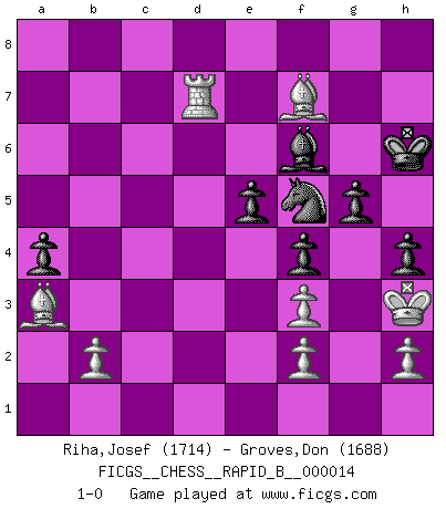 Last move : 1-0 2006 September 20 9:52:35 [Event "FICGS__CHESS__RAPID_B__000014"] [Site "FICGS"] [Date "2006.09.04"] [Round "1"] [White "Riha,Josef"] [Black "Groves,Don"] [Result "1-0"] [WhiteElo "1714"] [BlackElo "1688"] 1.e4 d6 2.d4 g6 3.Nf3 Bg7 4.Nc3 a6 5.Bc4 b5 6.Bb3 h6 7.e5 b4 8.Ne4 Nc6 9.O-O dxe5 10.dxe5 Qxd1 11.Rxd1 Nxe5 12.a3 Nxf3+ 13.gxf3 f5 14.Nc5 bxa3 15.Rxa3 e5 16.Bd2 Ne7 17.Ba5 Ra7 18.Ne6 Bxe6 19.Bxe6 Bf6 20.Rb3 Kf8 21.Rd7 Kg7 22.Bc3 f4 23.Bb4 Re8 24.Bc5 R7a8 25.Rxc7 a5 26.R3b7 Kf8 27.Kg2 a4 28.c4 h5 29.Bd6 g5 30.c5 h4 31.c6 Ra5 32.Rd7 R5a8 33.c7 Kg7 34.Rb8 Raxb8 35.cxb8Q Rxb8 36.Bxb8 Kg6 37.Bd6 Nf5 38.Bf7+ Kh6 39.Bf8+ Bg7 40.Ba3 Bf6 41.Kh3 1-0 King's pawn Opening Kingside Castling by player White (move 9) Promotion Queen by player White (move 35) Player White won this chess game. Follow this game move after move (download)Openings teach you openings. Endgames teach you chess ! (Stephan Gerzadowicz) Schach ist die gewalttätigste aller Sportarten. (Garry Kasparov) El Ajedrez moderno está demasiado preocupado con cosas como la estructura de Peones. Olvidenlo, el Jaque Mate termina la partida. (Nigel Short) La victoire dans une partie d'Echecs appartient la plupart du temps à celui qui voit un peu plus loin que l'adversaire. (Lasker) The only thing that overcomes hard luck is hard work. (Harry Golden)