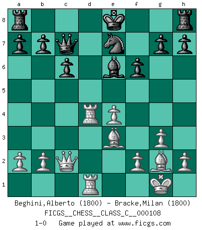 Last move : 1-0 2009 June 4 7:9:6 [Event "FICGS__CHESS__CLASS_C__000108"] [Site "FICGS"] [Date "2009.03.07"] [Round "1"] [White "Beghini,Alberto"] [Black "Bracke,Milan"] [Result "1-0"] [WhiteElo "1800"] [BlackElo "1800"] 1.Nf3 Nc6 2.g3 e5 3.d3 d5 4.Bg2 f6 5.O-O Be6 6.Nbd2 Qd7 7.e4 d4 8.c3 Bc5 9.Nb3 Bb6 10.cxd4 Nxd4 11.Nfxd4 Bxd4 12.Nxd4 Qxd4 13.Qc2 c6 14.Be3 Qd7 15.Rfd1 Ne7 16.d4 exd4 17.Rxd4 Qc7 18.Rad1 1-0 This chess game has been lost on time (started : 2009.03.07 15:5:53) Reti Opening Kingside Castling by player White (move 5) Player White won this chess game. Follow this game move after move (download)One doesn't have to play well, it's enough to play better than your opponent. (Siegbert Tarrasch) Das Schach ist nichts für kleine Geister, es beansprucht einen vollen Mann, der sich nicht sklavisch an das Überlieferte hält, sondern selbständig die Tiefen des Spiels zu ergründen sucht. (Wilhelm Steinitz) A la fecha, Fischer esta simplemente un nivel arriba de todos los mejores jugadores de Ajedrez del mundo. (John Jacobs) Les Echecs ont trois composantes : le temps, l'espace et le matériel en dernier. (Mikhail Tal) Luck is when opportunity knocks and you answer. (Anonymous)