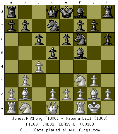 Last move : 0-1 2009 April 24 15:58:35 [Event "FICGS__CHESS__CLASS_C__000108"] [Site "FICGS"] [Date "2009.03.07"] [Round "1"] [White "Jones,Anthony"] [Black "Rabara,Bill"] [Result "0-1"] [WhiteElo "1800"] [BlackElo "1800"] 1.Nf3 c6 2.c4 d5 3.b3 Bf5 4.Bb2 e6 5.g3 h6 6.Bg2 Nd7 7.O-O Ngf6 0-1 This chess game has been lost on time (started : 2009.03.07 15:5:53) Reti Opening Kingside Castling by player White (move 7) Player Black won this chess game. Follow this game move after move (download)I play correspondence chess because it is both art and science while chess is art only. (A player at FICGS) Die jungen Leute sollen verstehen, dass sie noch etwas von mir lernen können und müssen. (Viktor Kortschnoi) El jugador de combinación piensa hacia adelante; comienza de la posición dada y trabaja las movidas contundentes en su mente. (Emanuel Lasker) Il vaut toujours mieux jouer un plan faux de façon logique que de n'avoir pas de plan du tout. (Victor Kortchnoï) The hypothalamus is one of the most important parts of the brain, involved in many kinds of motivation, among other functions. The hypothalamus controls the 'Four Fs: Fighting, Fleeing, Feeding and Mating. (Unknown author)