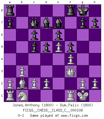 Last move : 0-1 2009 May 12 17:39:2 [Event "FICGS__CHESS__CLASS_C__000108"] [Site "FICGS"] [Date "2009.03.07"] [Round "1"] [White "Jones,Anthony"] [Black "Dum,Felix"] [Result "0-1"] [WhiteElo "1800"] [BlackElo "1800"] 1.b3 d5 2.Bb2 c5 3.e3 Nc6 4.Bb5 e6 5.Nf3 Nf6 6.O-O Bd6 7.Ne5 Qc7 8.f4 O-O 9.Bxc6 bxc6 10.Qf3 Nd7 11.Nxd7 Bxd7 12.e4 f5 13.e5 Be7 0-1 Nimzovich-Larsen attack : Classical variation Kingside Castling by player White (move 6) Kingside Castling by player Black (move 8) Player Black won this chess game. Follow this game move after move (download)Place the contents of the Chess box in a hat, shake them up vigorously, pour them on the board from a height of two feet, and you get the style of Steinitz. (H. E. Bird) Jeder leidlich begabte Spieler, er braucht keineswegs hervorragend veranlagt zu sein, kann es zum Meister bringen. Aber das ist ja auch gar nicht nötig! Der richtige Standpunkt ist es, zu seinem Vergnügen zu spielen, und man glaube ja nicht, dass der Genuss proportional dem Können sei. (Siegbert Tarrasch) Yo nunca en mi vida he jugado la Defensa Francesa, que viene siendo la más aburrida de todas las Aperturas. (Wilhelm Steinitz) Les échecs, c'est l'imagination. (David Bronstein) Hello Thibault, if I have had a plan (and I had one, I hope), I have forgotten it during the last week... - Hello Heinz-Georg. What do you mean a plan ? (Anonymous players, during a Big Chess game)