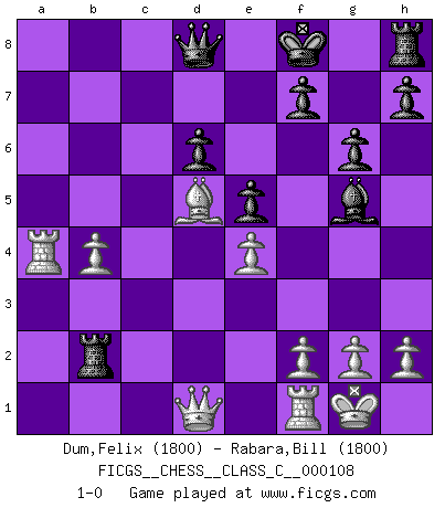 Last move : 1-0 2009 August 23 21:20:13 [Event "FICGS__CHESS__CLASS_C__000108"] [Site "FICGS"] [Date "2009.03.07"] [Round "1"] [White "Dum,Felix"] [Black "Rabara,Bill"] [Result "1-0"] [WhiteElo "1800"] [BlackElo "1800"] 1.e4 c5 2.Nf3 Nc6 3.d4 cxd4 4.Nxd4 Nf6 5.Nc3 e5 6.Ndb5 d6 7.Bg5 a6 8.Na3 b5 9.Nd5 Be7 10.Bxf6 Bxf6 11.c3 Rb8 12.Nc2 Bg5 13.a4 bxa4 14.Rxa4 Rxb2 15.Bxa6 Bd7 16.O-O Be6 17.Ncb4 Nxb4 18.Bb5+ Kf8 19.cxb4 g6 20.Bc6 Bxd5 21.Bxd5 1-0 Sicilian : Pelikan (Lasker/Sveshnikov) variation Kingside Castling by player White (move 16) Player White won this chess game. Follow this game move after move (download)Daring ideas are like Chess men moved forward. They may be beaten, but they may start a winning game. (Johann Wolfgang von Goethe) Schach ist Krieg, im Schach geht es um testosterongesteuerte Urschreie. (Garry Kasparov) Peones: ellos son el alma de esta partida, solos forman el ataque y la defensa. (Philidor) Soyez une menace à chaque fois que vous vous asseyez pour jouer. (Ken Smith) Life is verb, not a noun. (Charlotte Perkins Gilman)