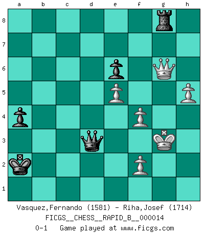 Last move : 0-1 2006 December 15 3:4:40 [Event "FICGS__CHESS__RAPID_B__000014"] [Site "FICGS"] [Date "2006.09.04"] [Round "1"] [White "Vasquez,Fernando"] [Black "Riha,Josef"] [Result "0-1"] [WhiteElo "1581"] [BlackElo "1714"] 1.e4 c5 2.d4 cxd4 3.c3 g6 4.cxd4 d5 5.e5 Nc6 6.Nc3 Nh6 7.Bb5 Bg7 8.Nge2 Nf5 9.O-O O-O 10.Ba4 Bd7 11.Bf4 e6 12.Qd2 f6 13.exf6 Bxf6 14.Bxc6 Bxc6 15.Rfe1 Rc8 16.Rad1 Qb6 17.b3 Bg7 18.Be5 Bxe5 19.dxe5 d4 20.Na4 Bxa4 21.bxa4 Rc4 22.a5 Qc5 23.Qd3 Rc8 24.Nf4 Rc6 25.Qf1 Qe7 26.Qe2 Qc7 27.Qb2 Rc2 28.Qb3 R2c3 29.Qb2 Qd7 30.Rb1 Rc7 31.Qe2 d3 32.Qd2 Qc6 33.Rb3 Nd4 34.R3b1 Rd7 35.Red1 Rc2 36.Qe3 d2 37.Nh5 Nf3+ 38.gxf3 gxh5 39.a6 Qxa6 40.Rb3 Qc4 41.Kh1 Qd5 42.Rg1+ Rg7 43.R3b1 Rxg1+ 44.Rxg1+ Kf7 45.Rd1 Rxa2 46.Kg2 a5 47.Qg5 b5 48.Qf6+ Ke8 49.Qh8+ Kd7 50.Qxh7+ Kc6 51.Qxh5 Kc5 52.Qg5 Kc4 53.h4 Kd3 54.Qe3+ Kc2 55.Qe2 Qd3 56.Rxd2+ Qxd2 57.Qxb5 Rb2 58.Qc4+ Kb1 59.Qf1+ Qc1 60.Qd3+ Qc2 61.Qe3 a4 62.Qe1+ Ka2 63.h5 Rb8 64.f4 Rb1 65.Qe3 Qd1 66.Kg3 Rb8 67.Qe4 Rg8+ 68.Qg6 Qd3+ 0-1 Sicilian : Smith-Morra gambit Kingside Castling by player White (move 9) Kingside Castling by player Black (move 9) Player Black won this chess game. Follow this game move after move (download)The game of chess is the touchstone of the intellect. (Goethe) Ich erzeugte keinen Neid, da mich die Schachspieler als Musiker und die Musiker als Schachspieler betrachteten. (Mark Taimanov) Cualquier cambio de material en una posición debe venir por medio de un mate, una captura o promoción de Peón. (Purdy) Avec des compensations pour le matériel en plus... (Anonyme) Ah, beer! The cause of, and the solution to, all of life's problems. (Homer Simpson)