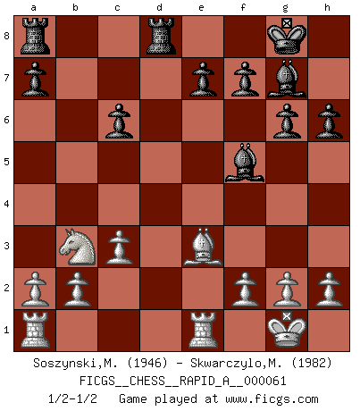 Last move : 1/2-1/2 2009 March 23 10:2:32 [Event "FICGS__CHESS__RAPID_A__000061"] [Site "FICGS"] [Date "2009.03.08"] [Round "1"] [White "Soszynski,Marek"] [Black "Skwarczylo,Marek"] [Result "1/2-1/2"] [WhiteElo "1946"] [BlackElo "1982"] 1.e4 c5 2.d4 cxd4 3.Qxd4 Nc6 4.Qa4 d6 5.Nf3 Nf6 6.Bd3 g6 7.O-O Bg7 8.e5 Nd7 9.exd6 Nc5 10.Qa3 Qxd6 11.Be2 Ne4 12.Qe3 Qe6 13.Na3 Nd6 14.c3 O-O 15.Nb5 Nxb5 16.Bxb5 Rd8 17.Re1 h6 18.Bxc6 bxc6 19.Nd4 Qxe3 20.Bxe3 Bd7 21.Nb3 Bf5 1/2-1/2 Sicilian : Smith-Morra gambit Kingside Castling by player White (move 7) Kingside Castling by player Black (move 14) This chess game ended in a draw. Follow this game move after move (download)The chessboard is the world, the pieces are the phenomena of the Universe, the rules of the game are what we call the laws of Nature and the player on the other side is hidden from us. (Thomas Huxley) Ich kenne keine einzige Person, die behaupten würde, Garri Kasparow sei ein guter Mensch (Nigel Short) Cuando tengo las piezas blancas, yo gano porque soy blanco; Cuando tengo las piezas negras, yo gano porque soy Bogolyubov. (Bogolyubov) Le jeu d'échecs est comme rejeté hors du temps. (Antoine de Saint-Exupéry) Better than a thousand days of diligent study is one day with a great teacher. (Japanese proverb)