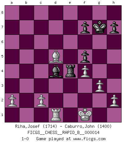 Last move : 1-0 2006 September 13 16:52:26 [Event "FICGS__CHESS__RAPID_B__000014"] [Site "FICGS"] [Date "2006.09.04"] [Round "1"] [White "Riha,Josef"] [Black "Caburro,John"] [Result "1-0"] [WhiteElo "1714"] [BlackElo "1400"] 1.e4 c5 2.Nf3 d6 3.d4 cxd4 4.Nxd4 Nf6 5.Nc3 g6 6.Be3 Bg7 7.f3 O-O 8.Qd2 Nc6 9.O-O-O Bd7 10.Bc4 Rb8 11.Nxc6 bxc6 12.Bxa7 Rb7 13.Be3 Qa5 14.Qe1 Rfb8 15.Bb3 c5 16.e5 Ne8 17.Nd5 Qxe1 18.Nxe7+ Kf8 19.Rhxe1 Bxe5 20.Nd5 c4 21.Bxc4 Bxb2+ 22.Kd2 Be5 23.Bh6+ Ng7 24.f4 Bd4 25.Re4 Bc5 26.Nf6 Bf5 27.Re2 Bd4 28.Re8+ Rxe8 29.Bxg7+ Kxg7 30.Nxe8+ Kf8 31.Nxd6 Rd7 32.Nxf5 gxf5 33.Ke2 Re7+ 34.Kf1 Re4 35.g3 Kg7 36.Bd5 1-0 Sicilian : Dragon, Yugoslav attack, 7...O-O Kingside Castling by player Black (move 7) Queenside Castling by player White (move 9) Player White won this chess game. Follow this game move after move (download)I look one move ahead... the best ! (Siegbert Tarrasch) Alles was ich jemals tun will ist Schach spielen. (Robert James Fischer) Por la belleza de sus partidas, la claridad de su juego y lo brillante de sus ideas, Fischer se creó el mismo como un artista de la misma estatura como Brahms, Rembrandt y Shakespeare. (David Levy) L'action d'une oeuvre littéraire se déroule sur un champ de bataille. Les masques et les types du drame moderne correspondent aux pièces du jeu d'échecs. L'intrigue correspond aux coups et aux gambits, c'est à dire aux techniques du jeu telles qu'utilisées et interprétées par les joueurs. Les tactiques et les péripéties [mouvements] correspondent aux coups exécutés par l'adversaire. (Viktor Shklovsky) It's not the will to win, but the will to prepare to win that makes the difference. (Bear Bryant)