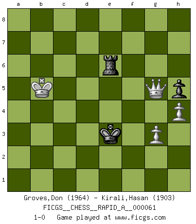 Last move : 1-0 2009 August 7 12:29:19 [Event "FICGS__CHESS__RAPID_A__000061"] [Site "FICGS"] [Date "2009.03.08"] [Round "1"] [White "Groves,Don"] [Black "Kirali,Hasan"] [Result "1-0"] [WhiteElo "1964"] [BlackElo "1903"] 1.d4 Nf6 2.Nf3 e6 3.c4 d5 4.Nc3 c6 5.e3 Nbd7 6.Bd3 dxc4 7.Bxc4 b5 8.Bd3 a6 9.a4 b4 10.Ne4 c5 11.Nxf6+ Nxf6 12.O-O Bb7 13.Qe2 cxd4 14.exd4 Be7 15.Be3 Qd5 16.Bc4 Qd6 17.Ne5 O-O 18.Rac1 Nd5 19.Qg4 Rad8 20.a5 Rc8 21.Bh6 Bf6 22.Rfe1 Rc7 23.h4 Ne7 24.Nxf7 Qxd4 25.Qxd4 Bxd4 26.Bxe6 Nd5 27.Nd6 Kh8 28.Be3 Rxc1 29.Rxc1 Nxe3 30.Nxb7 h5 31.Nd6 Ng4 32.Nf7+ Kh7 33.Rc2 Kg6 34.Rd2 Bxf2+ 35.Rxf2 Nxf2 36.Kxf2 Kf6 37.Ng5 Ke5 38.Ke3 Rf1 39.Bc4 Ra1 40.Nf3+ Kd6 41.Bxa6 Rxa5 42.Bc4 Rf5 43.Ke4 Rf6 44.g3 Rf8 45.b3 Re8+ 46.Kd4 Ke7 47.Kc5 Rb8 48.Ne5 Rc8+ 49.Kxb4 Kf6 50.Nf7 Rb8+ 51.Kc5 Kf5 52.Nd6+ Kg4 53.Ne4 Rc8+ 54.Kd4 Rb8 55.Bd5 Kf5 56.Kc5 Rd8 57.b4 Ke5 58.Nc3 Rc8+ 59.Bc6 Rd8 60.b5 Rd3 61.Ne4 Rd1 62.b6 Rc1+ 63.Kb5 Rb1+ 64.Ka6 Rc1 65.b7 Rxc6+ 66.Kb5 Re6 67.b8Q+ Kxe4 68.Qb7+ Kd4 69.Qxg7+ Ke3 70.Qg5+ 1-0 This chess game has been lost on time (started : 2009.03.08 13:49:35) Queen's pawn game Kingside Castling by player White (move 12) Kingside Castling by player Black (move 17) 10 pieces endgame at move 49 : White KBNPPP , Black KRPP WHITE : King + 1 Bishop 1 Knight 3 Pawns BLACK : King + 1 Rook 2 Pawns 9 pieces endgame at move 65 : White KNPPP , Black KRPP WHITE : King + 1 Knight 3 Pawns BLACK : King + 1 Rook 2 Pawns Promotion Queen by player White (move 67) 8 pieces endgame at move 67 : White KQPP , Black KRPP WHITE : King + 1 Queen 2 Pawns BLACK : King + 1 Rook 2 Pawns 7 pieces endgame at move 69 : White KQPP , Black KRP WHITE : King + 1 Queen 2 Pawns BLACK : King + 1 Rook 1 Pawn Player White won this chess game. Follow this game move after move (download)The hallmark of the artist is simplicity. (Larry Evans) Kostenjuk hat keinen Sexappeal. (Loek van Wely) El Ajedrez es el gimnasio de la mente. (Blaise Pascal) Les échecs sont plus proches de l'art de l'assassinat que de l'art de la guerre. (Arturo Perez-Reverte) For to win one hundred victories in one hundred battles is not the acme of skill. To subdue the enemy without fighting is the acme of skill. (Sun Tzu)