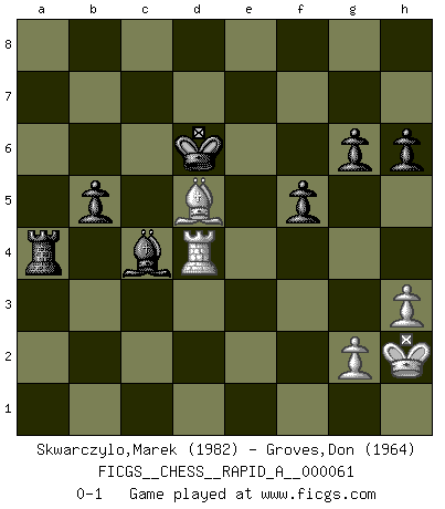 Last move : 0-1 2009 May 2 14:42:7 [Event "FICGS__CHESS__RAPID_A__000061"] [Site "FICGS"] [Date "2009.03.08"] [Round "1"] [White "Skwarczylo,Marek"] [Black "Groves,Don"] [Result "0-1"] [WhiteElo "1982"] [BlackElo "1964"] 1.d4 e6 2.Nf3 Nf6 3.c4 d5 4.Nc3 Nc6 5.e3 Bd6 6.Bd3 O-O 7.O-O dxc4 8.Bxc4 a6 9.e4 b5 10.Bd3 e5 11.d5 Ne7 12.a3 h6 13.Be3 Re8 14.Rc1 Nexd5 15.exd5 e4 16.Nxe4 Nxe4 17.Re1 Nf6 18.Bd4 Rxe1+ 19.Qxe1 Bb7 20.Nh4 Bxd5 21.Nf5 Bf8 22.Qc3 Ne4 23.Qxc7 Qg5 24.f3 Qxf5 25.Re1 Rc8 26.fxe4 Qg4 27.Qe5 Bb3 28.Bb1 Qd7 29.Bc3 Qd6 30.Qxd6 Bxd6 31.Rc1 Bc5+ 32.Kh1 Rd8 33.h3 Be3 34.Re1 Bd2 35.Bxd2 Rxd2 36.Kh2 Rxb2 37.e5 Bc4 38.Rc1 Re2 39.Bf5 Rxe5 40.Bc8 Re3 41.a4 Ra3 42.Bxa6 Rxa4 43.Bb7 Kf8 44.Re1 g6 45.Re4 f5 46.Rd4 Ke7 47.Bd5 Kd6 0-1 Queen's pawn Kingside Castling by player Black (move 6) Kingside Castling by player White (move 7) Player Black won this chess game. Follow this game move after move (download)Chess is the art which expresses the science of logic. (Mikhail Botvinnik) Darum geht es im Schach. Einen Tag gibst du deinem Gegner eine Lektion, am nächsten Tag gibt er dir eine. (Robert James Fischer) El Ajedrez es una guerra en un tablero. El objetivo es aplastar la mente del oponente. (Bobby Fischer) A chaque perte on perd un peu de soi. (Joël Lautier) I have opinions of my own - strong opinions - but I don't always agree with them. (George Bush)
