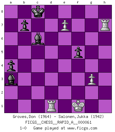 Last move : 1-0 2009 May 3 8:36:34 [Event "FICGS__CHESS__RAPID_A__000061"] [Site "FICGS"] [Date "2009.03.08"] [Round "1"] [White "Groves,Don"] [Black "Salonen,Jukka"] [Result "1-0"] [WhiteElo "1964"] [BlackElo "1942"] 1.d4 Nf6 2.Nf3 e6 3.c4 d5 4.Nc3 Be7 5.Bf4 O-O 6.e3 Na6 7.Be2 Nh5 8.O-O Nxf4 9.exf4 c6 10.a3 dxc4 11.Bxc4 Nc7 12.Qc2 g6 13.Rad1 Nd5 14.g3 Nxc3 15.Qxc3 a5 16.Ne5 a4 17.h4 Qa5 18.Qc2 Kg7 19.h5 gxh5 20.Kg2 f6 21.Nf3 Bd6 22.Rh1 Qf5 23.Bd3 Qd5 24.Bxh7 f5 25.Rxh5 Bd7 26.Rdh1 Kf7 27.Bg6+ Ke7 28.Rh7+ Kd8 29.Bf7 Be7 30.Qe2 Rc8 31.Qe5 c5 32.Qxd5 exd5 33.Bxd5 Rc7 34.dxc5 Bxc5 35.Ng5 Re8 36.Rd1 Kc8 37.Bf7 Bc6+ 38.Kf1 Bb5+ 39.Kg1 Rxf7 40.Nxf7 Re2 41.Rc1 Bc6 42.Ne5 Bxf2+ 43.Kf1 Rxe5 44.fxe5 Bd4 45.e6 Bxb2 46.Rd1 Bxa3 47.e7 1-0 Queen's pawn game Kingside Castling by player Black (move 5) Kingside Castling by player White (move 8) Player White won this chess game. Follow this game move after move (download)If I win a tournament, I win it by myself. I do the playing. Nobody helps me. (Bobby Fischer) Die meiste Zeit treffe ich auf Gegner, die meine Enkel sein könnten. Ich bin da, um ihnen zu zeigen, dass sie von mir noch einiges lernen können. (Viktor Kortschnoi) Algunos sacrificios son sólidos, los demás son míos. (Mikhail Tal) Je crois qu'il existe des manières très spécifiques de jouer efficacement contre une machine. Evidemment, nous n'avons aucune chance en technique pure, parce que l'ordinateur calcule de manière parfaite. Mais lorsque nous faisons appel à notre cerveau, en utilisant l'intuition et la compréhension, alors nous restons beaucoup plus forts. (Anatoli Karpov) Do not put your faith in what statistics say until you have carefully considered what they do not say. (William W. Watt)