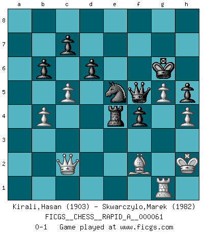 Last move : 0-1 2009 May 3 0:4:20 [Event "FICGS__CHESS__RAPID_A__000061"] [Site "FICGS"] [Date "2009.03.08"] [Round "1"] [White "Kirali,Hasan"] [Black "Skwarczylo,Marek"] [Result "0-1"] [WhiteElo "1903"] [BlackElo "1982"] 1.Nf3 Nf6 2.c4 g6 3.d4 Bg7 4.Nc3 O-O 5.e4 d6 6.Be2 e5 7.d5 Nbd7 8.O-O Nc5 9.Qc2 a5 10.Bg5 h6 11.Be3 b6 12.Nd2 Ng4 13.Bxg4 Bxg4 14.a3 Na6 15.b3 Bd7 16.Rab1 f5 17.exf5 gxf5 18.f3 Kh8 19.Rfe1 Rg8 20.Re2 Qh4 21.Kh1 Bf6 22.Nb5 Qh5 23.Qc3 Kh7 24.Rg1 Bh4 25.Qc2 Bg3 26.Nf1 Bh4 27.Bf2 Bg5 28.Qc3 Bf4 29.g3 Bg5 30.Nd2 Raf8 31.Qd3 Rg6 32.Rg2 Bxd2 33.Rxd2 f4 34.g4 Qh3 35.Rd1 h5 36.g5 Bf5 37.Qe2 Re8 38.Nd4 Bd7 39.Ne6 Bxe6 40.dxe6 Qf5 41.e7 Rxe7 42.h4 Rge6 43.Kg1 Kg6 44.Qb2 Re8 45.Rd5 Qh3 46.Qc2+ e4 47.fxe4 Rxe4 48.Rh2 Qe6 49.Rg2 Nc5 50.Kh2 Rf8 51.b4 axb4 52.axb4 Nd7 53.Rd4 Re8 54.Rg1 Qf5 55.Rxe4 Rxe4 56.c5 Ne5 0-1 Reti Opening Kingside Castling by player Black (move 4) Kingside Castling by player White (move 8) Player Black won this chess game. Follow this game move after move (download)The tactician must know what to do whenever something needs doing; the strategist must know what to do when nothing needs doing. (Savielly Tartakover) Dein Körper muss in Topform sein. Dein Schach verfällt, wenn dein Körper verfällt. Der Körper kann nicht vom Geist getrennt werden. (Robert James Fischer) Todo se encuentra en un estado de flujo y esto incluye al mundo del Ajedrez. (Mikhail Botvinnik) Soyez une menace à chaque fois que vous vous asseyez pour jouer. (Ken Smith) Winning isn't everything... but losing is nothing. (Mednis)