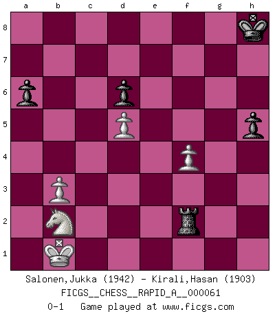 Last move : 0-1 2009 May 2 7:37:41 [Event "FICGS__CHESS__RAPID_A__000061"] [Site "FICGS"] [Date "2009.03.08"] [Round "1"] [White "Salonen,Jukka"] [Black "Kirali,Hasan"] [Result "0-1"] [WhiteElo "1942"] [BlackElo "1903"] 1.e4 Nc6 2.Nf3 d6 3.d4 Nf6 4.Nc3 Bg4 5.Be3 e6 6.Be2 Be7 7.d5 exd5 8.exd5 Bxf3 9.gxf3 Ne5 10.Rg1 O-O 11.f4 Ng6 12.Qd2 c5 13.O-O-O Qc8 14.Kb1 a6 15.a3 b5 16.Qd3 Re8 17.Rg2 Qb7 18.Rdg1 Bf8 19.Rg5 Rab8 20.b3 Kh8 21.Kb2 Ne7 22.Ka1 g6 23.Bf3 Bg7 24.Ka2 c4 25.Qd1 b4 26.axb4 cxb3+ 27.cxb3 Qxb4 28.Bd2 Nf5 29.Rxf5 gxf5 30.Na4 Qd4 31.Be3 Qxd1 32.Rxd1 Ng4 33.Bb6 Nxh2 34.Bg2 Rbc8 35.Ka3 Rc2 36.Bh3 Ng4 37.f3 Nf2 38.Bxf5 Nxd1 39.Bxc2 Ne3 40.Be4 f5 41.Bxe3 fxe4 42.fxe4 Rxe4 43.Bf2 Bd4 44.Bg3 h5 45.Nb2 Bc5+ 46.Ka2 Re2 47.Kb1 Bf2 48.Bxf2 Rxf2 0-1 KP : Nimzovich defense Kingside Castling by player Black (move 10) Queenside Castling by player White (move 13) 10 pieces endgame at move 48 : White KNPPP , Black KRPPP WHITE : King + 1 Knight 3 Pawns BLACK : King + 1 Rook 3 Pawns Player Black won this chess game. Follow this game move after move (download)Though most people love to look at the games of the great attacking masters, some of the most successful players in history have been the quiet positional players. They slowly grind you down by taking away your space, tying up your pieces, and leaving you with virtually nothing to do ! (Yasser Seirawan) Frage des Reporters: -Welche besonderen Umstände rechtfertigen das Anhalten der Uhren während einer Turnierpartie? Antwort: -Einen Fotographen zu strangulieren. (Siegbert Tarrasch) Un Peón pasado aumenta su poder a medida de que el número de piezas en el tablero disminuye. (Capablanca) Comme les marins qui ont mille raisons différentes d'aller en mer, les joueurs d'échecs en ont tout autant avant de s'installer devant une table et jouer... (Vincent Bertignac, philosophe) You think that education is too expensive ? Try ignorance. (Derek Bok)