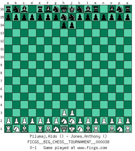 Last move : 0-1 2009 April 8 2:17:13 [Event "FICGS__BIG_CHESS__TOURNAMENT__000038"] [Site "FICGS"] [Date "2009.03.08"] [Round "1"] [White "Pllumaj,Aldo"] [Black "Jones,Anthony"] [Result "0-1"] [WhiteElo ""] [BlackElo ""] 0-1 This big chess game has been lost on time (started : 2009.03.08 22:29:29) Follow this game move after move (download)Chess is 99 percent tactics. (Teichmann) Obwohl ich alt bin, darf mir niemand den Finger in den Mund stecken, sonst beisse ich. (Wilhelm Steinitz) El Ajedrez hace al hombre ser mas sabio y ver mas claro. (Vladimir Putin) Tous ces prétendus hommes politiques sont les pions, les Cavaliers, les Tours ou les Fous d'une partie d'échecs qui se jouera tant qu'un hasard ne renversera pas l'échiquier. (Honoré de Balzac) Fortune favours the audacious. (Desiderius Erasmus)