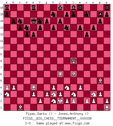 Last move : 1-0 2009 May 15 6:4:23 [Event "FICGS__BIG_CHESS__TOURNAMENT__000038"] [Site "FICGS"] [Date "2009.03.08"] [Round "1"] [White "Pipac,Darko"] [Black "Jones,Anthony"] [Result "1-0"] [WhiteElo ""] [BlackElo ""] 1.j2-k4 d15-d13 2.p2-p3 e15-e13 3.g2-g3 c15-c13 4.o1-q3 b16-c14 5.h3-h4 n15-n13 6.f1-m7 c16-m7 7.q3-m7 g16-e15 8.g1-h3 f15-f13 9.d2-d4 m15-m13 10.k1-l3 j15-k13 11.h1-f3 g15-g14 12.m2-m4 h16-m12 13.m7-l6 m12-d4 14.e2-e3 d4-d11 15.e1-d1 d11-c12 16.a2-a4 c12-c2 17.l1-n3 b15-b14 18.j1-j2 e13-e12 19.d1-d2 c2-c12 20.a1-a3 d13-d12 21.a3-c3 c12-e14 22.d2-d4 h14-h13 23.b1-a3 f16-l11 24.m1-d1 p15-p14 25.f3-l8 l11-d4 26.d1-d4 o16-p15 27.d4-e4 e15-d13 28.c3-c6 p16-n15 29.c6-e6 h15-f14 30.n3-p5 k16-h15 31.p1-o3 o15-o13 32.b2-b4 n13-n12 33.e6-j6 1-0 This big chess game has been lost on time (started : 2009.03.08 22:29:29) Follow this game move after move (download)Alekhine is a poet who creates a work of art out of something that would hardly inspire another man to send home a picture post card. (Max Euwe) Die starken Figuren des Gegners muss man abtauschen. (José Raúl Capablanca) Robert Fischer es la ley hacia si mismo. (Larry Evans) Tout change constamment, y compris dans le monde des Echecs. (Botvinnik) Perhaps chess is the wrong game for the times (The Chess Master and the Computer, by Garry Kasparov - 2010)