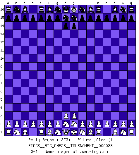 Last move : 0-1 2009 March 9 11:44:35 [Event "FICGS__BIG_CHESS__TOURNAMENT__000038"] [Site "FICGS"] [Date "2009.03.08"] [Round "1"] [White "Petty,Brynn"] [Black "Pllumaj,Aldo"] [Result "0-1"] [WhiteElo "1273"] [BlackElo ""] 0-1 Follow this game move after move (download)I love all positions. Give me a difficult positional game, I will play it. But totally won positions, I cannot stand them. (Hein Donner) Es ist wirklich schade, dass so viele Schachspieler nicht auf ihr Äußeres achten! (Alexandra Kosteniuk) Si un gobernante no entiende al Ajedrez, ¿como puede governar él un reinado?. (El Rey Khusros II) D'abord les bases : Jouez et étudiez, puis étudiez et jouez, ensuite jouez et étudiez, puis étudiez et jouez. Deuxièmement : Donnez toujours le meilleur de vous-même ! (Ken Smith) Optimism is a variety of information deficit. Sometimes especially true for correspondence chess games. (Michael Aigner)