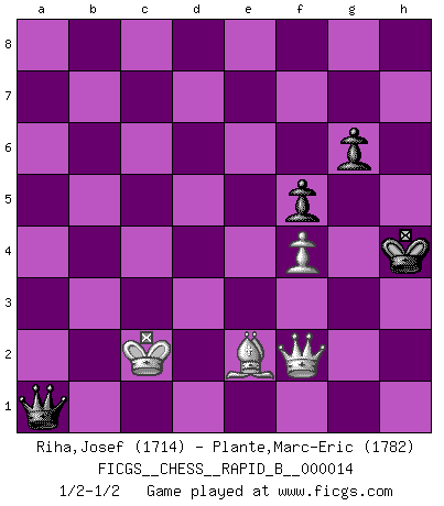 Last move : 1/2-1/2 2006 November 25 21:27:35 [Event "FICGS__CHESS__RAPID_B__000014"] [Site "FICGS"] [Date "2006.09.04"] [Round "1"] [White "Riha,Josef"] [Black "Plante,Marc-Eric"] [Result "1/2-1/2"] [WhiteElo "1714"] [BlackElo "1782"] 1.e4 c5 2.Nf3 d6 3.d4 cxd4 4.Nxd4 Nf6 5.Nc3 a6 6.f3 e6 7.Be3 Nc6 8.Nxc6 bxc6 9.Qd2 d5 10.O-O-O Qc7 11.exd5 cxd5 12.Bf4 Qb6 13.Na4 Qc6 14.Qa5 Nd7 15.Kb1 Be7 16.b3 Bb7 17.c4 O-O 18.Bd3 Rfc8 19.Rhe1 Bd8 20.Qb4 Nf6 21.c5 Nd7 22.Bd6 h6 23.f4 Bc7 24.Bxc7 Qxc7 25.Nb6 Nxb6 26.cxb6 Qd8 27.f5 exf5 28.Rc1 Rxc1+ 29.Rxc1 a5 30.Qd4 Qg5 31.Qf2 g6 32.Rc7 Rb8 33.h4 Qg4 34.Kb2 a4 35.h5 Qxh5 36.Qc5 Qd1 37.Qe7 Rf8 38.Qe2 Qg1 39.Rxb7 Qd4+ 40.Kb1 Qg1+ 41.Qf1 Qd4 42.Bb5 axb3 43.axb3 Ra8 44.Ra7 Rb8 45.Ra6 Rxb6 46.Rxb6 Qxb6 47.b4 Kg7 48.Kb2 f6 49.Qe2 Qd6 50.Kb3 h5 51.Bd3 f4 52.b5 f5 53.Qe8 f3 54.gxf3 h4 55.Qc6 Qe5 56.b6 h3 57.Bf1 Qe3+ 58.Qc3+ d4 59.Qxe3 dxe3 60.Kc2 e2 61.Bxe2 h2 62.b7 h1Q 63.b8Q Qa1 64.Qc7+ Kf6 65.Qd6+ Kg5 66.f4+ Kh4 67.Qe7+ Kg3 68.Qe3+ Kh4 69.Qf2+ Kh3 70.Qf3+ Kh4 71.Qf2+ 1/2-1/2 Sicilian : Najdorf Queenside Castling by player White (move 10) Kingside Castling by player Black (move 17) 10 pieces endgame at move 59 : White KQBPP , Black KPPPP WHITE : King + 1 Queen 1 Bishop 2 Pawns BLACK : King + 4 Pawns 9 pieces endgame at move 59 : White KBPP , Black KPPPP WHITE : King + 1 Bishop 2 Pawns BLACK : King + 4 Pawns 8 pieces endgame at move 61 : White KBPP , Black KPPP WHITE : King + 1 Bishop 2 Pawns BLACK : King + 3 Pawns Promotion Queen by player Black (move 62) Promotion Queen by player White (move 63) This chess game ended in a draw. Follow this game move after move (download)All Chess players should have a hobby. (Savielly Tartakower) Wenn sie aufgeben, dann danke ich Ihnen für das Spiel (Eventualzug beim Fernschach). (Anonymous) La pasion por jugar al Ajedrez es una de las mas inexplicables en el mundo. (H.G. Wells) Les erreurs sont comme les malheurs, elles n'arrivent jamais seules. (Siegbert Tarrasch) But they are useless. They can only give you answers. (Pablo Picasso, about computers)