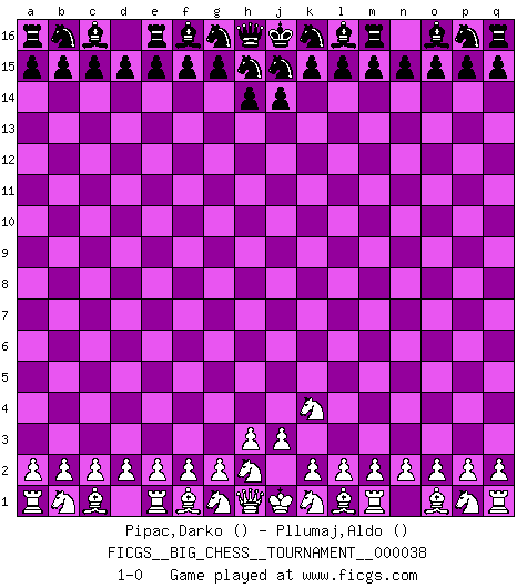 Last move : 1-0 2009 April 8 14:18:6 [Event "FICGS__BIG_CHESS__TOURNAMENT__000038"] [Site "FICGS"] [Date "2009.03.08"] [Round "1"] [White "Pipac,Darko"] [Black "Pllumaj,Aldo"] [Result "1-0"] [WhiteElo ""] [BlackElo ""] 1.j2-k4 1-0 This big chess game has been lost on time (started : 2009.03.08 22:29:29) Follow this game move after move (download)There's never before been a Chess player with such a thorough knowledge of the intricacies of the game and such an absolutely indomitable will to win. I think Bobby is the greatest player that ever lived. (Lisa Lane) Das ganze Leben mit einer Ehefrau ist wie ein Endspiel mit ungleichfarbigen Läufern. (Viktor Kortschnoi) Botvinnik trató de alejar el misterio referente al Ajedrez, siempre relacionandolo a situaciones de la vida diaria. Solía llamar al Ajedrez un problema inexacto típico, similar a aquellos en que la gente tiene siempre que resolver a cada día. (Garry Kasparov) Psychologiquement, tu dois avoir confiance en toi même, mais cette confiance doit être basée sur des faits. (Robert Fischer) No, I am still playing. (Anatoly Karpov)