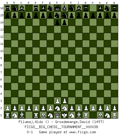 Last move : 0-1 2009 April 8 2:17:13 [Event "FICGS__BIG_CHESS__TOURNAMENT__000038"] [Site "FICGS"] [Date "2009.03.08"] [Round "1"] [White "Pllumaj,Aldo"] [Black "Grosdemange,David"] [Result "0-1"] [WhiteElo ""] [BlackElo "1497"] 0-1 This big chess game has been lost on time (started : 2009.03.08 22:29:29) Follow this game move after move (download)Tactics flow from a superior position. (Bobby Fischer) Über die Verhaftung Bobby Fischers: Warum es die Bush-Administration für nötig befindet einen 61 Jahre alten Mann zu hetzten, der für niemanden ausser sich selbste eine Gefahr darstellt ist ein Rätsel. (Nigel Short) La esencia del Ajedrez es pensar acerca de lo que el Ajedrez es. (David Bronstein) Même si l'adversaire joue le coup analysé précédemment, recommencez l'analyse en voyant la nouvelle position. Première règle de Blumenfeld A good programmer is someone who always looks both ways before crossing a one-way street. (Doug Linder)