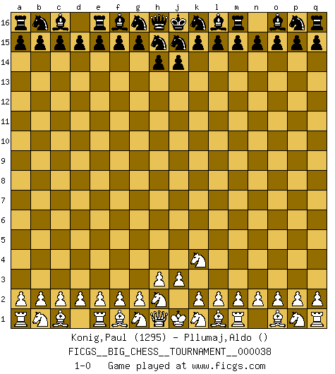 Last move : 1-0 2009 April 8 2:17:13 [Event "FICGS__BIG_CHESS__TOURNAMENT__000038"] [Site "FICGS"] [Date "2009.03.08"] [Round "1"] [White "Konig,Paul"] [Black "Pllumaj,Aldo"] [Result "1-0"] [WhiteElo "1295"] [BlackElo ""] 1.j2-k4 1-0 This big chess game has been lost on time (started : 2009.03.08 22:29:29) Follow this game move after move (download)Who is your opponent tonight, tonight I am playing against the Black pieces. (Akiba Rubinstein) Ein Schachspiel besteht aus drei Phasen: Die erste, wenn du hofftst den Vorteil zu haben, die zweite, wenn du glaubst einen Vorteil zu haben, und die dritte.... wenn du weißt Du wirst verlieren. (Savielly Grigorievitsch Tartakower) La caracteristica mas importante en la posición del Ajedrez es la actividad de las piezas. Esto es absolutamente fundamental en todas las fases del juego: Apertura, Juego Medio y especialmente Finales. La limitación primordial en la actividad de una pieza, es la estructuración de los Peones. (Michael Stean) La vérité est comme le meilleur coup aux échecs : elle existe, mais il faut la chercher. (Arturo Perez-Reverte) Pretend inferiority and encourage his arrogance. (Sun Tzu)