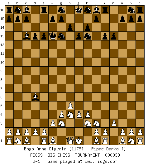Last move : 0-1 2009 April 22 3:48:56 [Event "FICGS__BIG_CHESS__TOURNAMENT__000038"] [Site "FICGS"] [Date "2009.03.08"] [Round "1"] [White "Engo,Arne Sigvald"] [Black "Pipac,Darko"] [Result "0-1"] [WhiteElo "1179"] [BlackElo ""] 1.k1-l3 j15-k13 2.g1-f3 d15-d13 3.g2-g4 e15-e13 4.k2-k4 m15-m13 5.h3-h4 h15-g13 6.j3-j4 j14-j13 7.j2-g3 n15-n13 8.h2-k3 k15-k14 9.h4-h5 h16-h15 10.f3-h4 f16-c13 11.n2-n3 h15-f13 12.f2-f3 o16-d6 0-1 This big chess game has been lost on time (started : 2009.03.08 22:29:29) Follow this game move after move (download)If your opponent offers you a draw, try to work out why he thinks he's worse off. (Nigel Short) Nach Morphy wurde nichts neues mehr in der Behandlung offener Positionen gefunden. (Mikhail Moiseyevich Botvinik) Las combinaciones han sido siempre el aspecto más intrigante del Ajedrez. Los Maestros las buscan, el público las aplauden, los críticos las alaban. La razón se debe a que las combinaciones hacen posible que el Ajedrez sea más que un ejercicio matemático con una carencia de vida. Ellas son la poesía del juego, son del Ajedrez lo que la melodía es de la música. Ellas representan el triunfo de la mente sobre la materia. (Reuben Fine) Nous sommes les pions de la mystérieuse partie d'Echecs jouée par Dieu. Il nous déplace, nous arrête, nous pousse encore, puis nous lance un à un dans la boîte du Néant. Epitaphe sur la tombe de David Janowsky (1868-1927). If only faces could talk... (Pat Summerall, Sportscaster during the Super Bowl)
