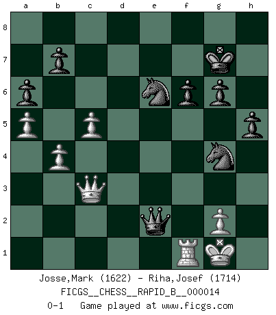Last move : 0-1 2006 September 22 13:43:53 [Event "FICGS__CHESS__RAPID_B__000014"] [Site "FICGS"] [Date "2006.09.04"] [Round "1"] [White "Josse,Mark"] [Black "Riha,Josef"] [Result "0-1"] [WhiteElo "1622"] [BlackElo "1714"] 1.e4 c5 2.Nf3 d6 3.d4 cxd4 4.Nxd4 Nf6 5.Nc3 a6 6.Be3 e6 7.Be2 Be7 8.a4 Nc6 9.O-O O-O 10.f4 Qc7 11.Kh1 Re8 12.Bf3 Bf8 13.Qd2 Na5 14.b3 Bd7 15.Rad1 h6 16.Qe1 Rac8 17.Nde2 Nc6 18.Qf2 Be7 19.Rd2 Qb8 20.Rfd1 e5 21.Qg3 Bf8 22.a5 Kh8 23.Bb6 Nb4 24.fxe5 Rxe5 25.Bd4 Qc7 26.Bxe5 dxe5 27.Qh4 Bc5 28.h3 Re8 29.Qg3 Kg8 30.Bg4 Bxg4 31.hxg4 Qc8 32.Rf1 Nxg4 33.Nd1 h5 34.c3 Nc6 35.Rd3 Ba7 36.Qh4 g6 37.b4 Re7 38.Qg5 Rd7 39.R1f3 Nd8 40.Qd2 Rxd3 41.Qxd3 Ne6 42.c4 Bd4 43.Rf1 Qd7 44.Nxd4 exd4 45.Qg3 Ng5 46.e5 d3 47.e6 Nxe6 48.Qb8+ Nf8 49.Re1 Kg7 50.c5 d2 51.Rf1 Ne6 52.Qg3 Qb5 53.Qc3+ f6 54.Kg1 Qe2 55.Qg3 Qe4 56.Nf2 Qe1 57.Qc3 Qxf2+ 58.Rxf2 d1Q+ 59.Rf1 Qe2 0-1 Sicilian : Najdorf, Byrne (English) attack Kingside Castling by player White (move 9) Kingside Castling by player Black (move 9) Promotion Queen by player Black (move 58) Player Black won this chess game. Follow this game move after move (download)White lost because he failed to remember the right continuation and had to think up the moves himself. (Siegbert Tarrasch) Der beste Spieler in einem Turnier gewinnt es nie. Er landet auf Platz zwei oder drei. (Siegbert Tarrasch) Una mala movida nulifica cuarenta buenas. (Horowitz) Que feriez-vous si vous étiez en train de jouer aux échecs et que la fin du monde arrive ? Je continuerais à jouer. (Saint Borromée) 98% of all statistics are made up. (Author unknown)