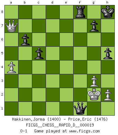 Last move : 0-1 2009 June 3 11:53:14 [Event "FICGS__CHESS__RAPID_D__000019"] [Site "FICGS"] [Date "2009.03.09"] [Round "1"] [White "Hakkinen,Jorma"] [Black "Price,Eric"] [Result "0-1"] [WhiteElo "1400"] [BlackElo "1476"] 1.d4 e6 2.a3 Nf6 3.Nf3 b6 4.c4 Bb7 5.Nc3 Be7 6.Bg5 Ne4 7.Bxe7 Qxe7 8.Qc2 f5 9.e3 d6 10.Bd3 Nxc3 11.bxc3 Nd7 12.O-O Nf6 13.Rfe1 Ne4 14.Rac1 O-O 15.d5 exd5 16.cxd5 Bxd5 17.Nd4 c5 18.Nf3 Ng5 19.Nxg5 Qxg5 20.g3 Bf3 21.e4 fxe4 22.Bxe4 Bxe4 23.Qxe4 Rae8 24.Qc6 Rxe1+ 25.Rxe1 Qd2 26.Rf1 Qxc3 27.Qxd6 Qd4 28.Qe6+ Kh8 29.Qe7 Qd8 30.Qxa7 Qf6 31.a4 h5 32.Rc1 Qxf2+ 33.Kh1 Qf3+ 34.Kg1 Qe3+ 35.Kh1 Qxc1+ 36.Kg2 Qf1+ 0-1 Queen's pawn Kingside Castling by player White (move 12) Kingside Castling by player Black (move 14) Player Black won this chess game. Follow this game move after move (download)If Chess is a science, it's a most inexact one. If Chess is an art, it is too exacting to be seen as one. If Chess is a sport, it's too esoteric. If Chess is a game, it's too demanding to be just a game. If Chess is a mistress, she's a demanding one. If Chess is a passion, it's a rewarding one. If Chess is life, it's a sad one. (Unknown) Der Freibauer hat für mich eine Seele, genau wie der Mensch, Wünsche, die unerkannt in ihm schlummern, und Befürchtungen, von deren Existenz er selbst kaum ahnt. (Aaron Nimzowitsch) No puedes jugar al Ajedrez si eres de corazón noble. (Proverbio Francés) On est toujours la mazette de quelqu'un d'autre. (Anonyme) Always two there are. No more no less. A master, and an apprentice. (Master Yoda in Star Wars ep.1)