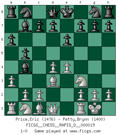 Last move : 1-0 2009 April 11 1:58:19 [Event "FICGS__CHESS__RAPID_D__000019"] [Site "FICGS"] [Date "2009.03.09"] [Round "1"] [White "Price,Eric"] [Black "Petty,Brynn"] [Result "1-0"] [WhiteElo "1476"] [BlackElo "1400"] 1.e4 a6 2.d4 b5 3.Nf3 Bb7 4.Bd3 e6 5.O-O Bb4 6.a3 1-0 St. George (Baker) defense Kingside Castling by player White (move 5) Player White won this chess game. Follow this game move after move (download)The blunders are all there on the board, waiting to be made. (Savielly Tartakover) Intelligenz läßt sich nicht am Weg, sondern nur am Ergebnis feststellen. (Garry Kasparov) Una victoria por una combinación errónea, aunque sea espectacular, me llena de horror artístico. (Wilhelm Steinitz) La tactique est l'élément le plus important du milieu de jeu. (Siegbert Tarrasch) Over-the-board chess is the favorite of mortals, correspondence chess is the favorite of the gods. (Eduard Dyckhoff)