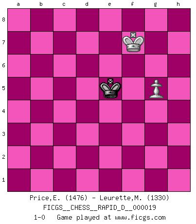 Last move : 1-0 2009 May 4 16:54:42 [Event "FICGS__CHESS__RAPID_D__000019"] [Site "FICGS"] [Date "2009.03.09"] [Round "1"] [White "Price,Eric"] [Black "Leurette,Marc-Antoine"] [Result "1-0"] [WhiteElo "1476"] [BlackElo "1330"] 1.e4 e5 2.Nf3 Nc6 3.Bb5 Nf6 4.O-O Nxe4 5.d4 Nd6 6.Bxc6 bxc6 7.dxe5 Nf5 8.Nc3 d5 9.exd6 cxd6 10.Nd4 Bd7 11.Re1+ Be7 12.Bg5 O-O 13.Nxf5 Bxg5 14.Nxd6 Rb8 15.Nc4 Bf5 16.Ne4 Qxd1 17.Raxd1 Bxe4 18.Rxe4 Rbd8 19.Rxd8 Rxd8 20.f4 Bf6 21.c3 g6 22.Kf2 Kg7 23.Ke2 h5 24.h3 Kh6 25.Ne3 Rb8 26.b3 Bxc3 27.Rc4 Ba5 28.Rxc6 Bb6 29.Kf3 Bxe3 30.Kxe3 Re8+ 31.Kf2 Rd8 32.Rc2 f6 33.h4 Rf8 34.Rc4 g5 35.hxg5+ fxg5 36.Rc6+ Kg7 37.Rc4 gxf4 38.Kf3 Kg6 39.Rxf4 Rxf4+ 40.Kxf4 a5 41.a3 Kf6 42.b4 axb4 43.axb4 Ke6 44.b5 Kd6 45.Kg5 Kc5 46.Kxh5 Kxb5 47.Kg6 Kc5 48.Kf7 Kd5 49.g4 Ke5 50.g5 1-0 Ruy Lopez : Berlin defense, Open variation Kingside Castling by player White (move 4) Kingside Castling by player Black (move 12) 10 pieces endgame at move 37 : White KRPPP , Black KRPPP WHITE : King + 1 Rook 3 Pawns BLACK : King + 1 Rook 3 Pawns 9 pieces endgame at move 39 : White KRPPP , Black KRPP WHITE : King + 1 Rook 3 Pawns BLACK : King + 1 Rook 2 Pawns 8 pieces endgame at move 39 : White KPPP , Black KRPP WHITE : King + 3 Pawns BLACK : King + 1 Rook 2 Pawns 7 pieces endgame at move 40 : White KPPP , Black KPP WHITE : King + 3 Pawns BLACK : King + 2 Pawns 6 pieces endgame at move 42 : White KPP , Black KPP WHITE : King + 2 Pawns BLACK : King + 2 Pawns 5 pieces endgame at move 43 : White KPP , Black KP WHITE : King + 2 Pawns BLACK : King + 1 Pawn 4 pieces endgame at move 46 : White KPP , Black K WHITE : King + 2 Pawns BLACK : King + 3 pieces endgame at move 46 : White KP , Black K WHITE : King + 1 Pawn BLACK : King + Player White won this chess game. Follow this game move after move (download)In blitz, the Knight is stronger than the Bishop. (Vlastimil Hort) Korrekt heißt in Deutschland die Haltung eines Mannes, dessen Benehmen nach dem Urteile seiner Nachbarn seiner Stellung angemessen ist. Um korrekt zu sein, muß man sich der Meinung der anderen anpassen... (Emanuel Lasker) El Ajedrez detiene a su maestro dentro de sus propios vínculos, encadenando la mente y el cerebro, por lo que la libertad interior del mas fuerte debe sufrir. (Albert Einstein) Des idées, des idées, j'en ai cent, j'en ai mille. Des bonnes, des mauvaises, applicables, irréalisables... Il suffit de faire le tri ! (Roos) Whatever you do, don't be bored. This is absolutely the most exciting time we could have possibly hoped to be alive. And things are just starting. (From movie Waking life)