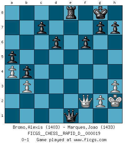 Last move : 0-1 2009 April 7 22:6:1 [Event "FICGS__CHESS__RAPID_D__000019"] [Site "FICGS"] [Date "2009.03.09"] [Round "1"] [White "Bromo,Alexis"] [Black "Marques,Joao"] [Result "0-1"] [WhiteElo "1403"] [BlackElo "1433"] 1.e4 e5 2.Nf3 Nc6 3.Bb5 a6 4.Ba4 b5 5.Bb3 Be7 6.c3 Nf6 7.O-O O-O 8.Re1 Bc5 9.d4 exd4 10.cxd4 Bb6 11.Nc3 d6 12.a3 Re8 13.d5 Ne5 14.Nxe5 Rxe5 15.a4 b4 16.Ne2 Nxe4 17.Be3 Bxe3 18.fxe3 Qg5 19.Nf4 Nc5 20.Bc2 Bg4 21.Qd2 a5 22.h3 Bf3 23.Kh2 Bxd5 24.Nxd5 Rxd5 25.Qf2 Re8 26.e4 Rde5 27.Rf1 Qe7 28.Rae1 f6 29.b3 Nxe4 30.Bxe4 Rxe4 31.Rxe4 Qxe4 32.Re1 Qxe1 0-1 Ruy Lopez : Caro variation Kingside Castling by player White (move 7) Kingside Castling by player Black (move 7) Player Black won this chess game. Follow this game move after move (download)The Pin is mightier than the sword. (Fred Reinfeld) Das Schach hält seine Meister in eigenen Banden, Fesseln; auf vielerlei Weise formt es ihren Geist, so dass die innere Freiheit selbst des Stärksten beeinflusst wird. (Albert Einstein) Un jugador que trata de regresar una movida en el Ajedrez es un futuro carterista. (Richard Fenton) Pour moi, les échecs ne sont pas un jeu mais un art. (Alexandre Alekhine) When you have everything, sometimes it feels like nothing. (Horatio Caine, C.S.I. Miami)