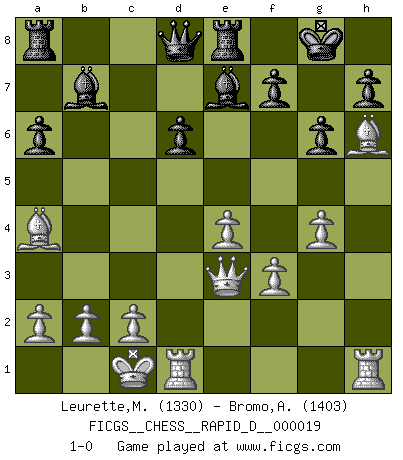 Last move : 1-0 2009 March 11 6:9:0 [Event "FICGS__CHESS__RAPID_D__000019"] [Site "FICGS"] [Date "2009.03.09"] [Round "1"] [White "Leurette,Marc-Antoine"] [Black "Bromo,Alexis"] [Result "1-0"] [WhiteElo "1330"] [BlackElo "1403"] 1.e4 c5 2.Nc3 e6 3.Nf3 Nc6 4.d4 cxd4 5.Nxd4 d6 6.Be3 Nf6 7.Bc4 a6 8.Qe2 Be7 9.O-O-O Nxd4 10.Bxd4 b5 11.Bb3 Bb7 12.f3 O-O 13.g4 e5 14.Bxe5 b4 15.Bxf6 bxc3 16.Bxc3 Bg5+ 17.Bd2 g6 18.h4 Bxh4 19.Bf4 Bg5 20.Qe3 Be7 21.Bh6 Re8 22.Ba4 1-0 Sicilian : Closed Queenside Castling by player White (move 9) Kingside Castling by player Black (move 12) Player White won this chess game. Follow this game move after move (download)It is no time to be playing Chess when the house is on fire. (Italian Proverb) Charakterschwächen offenbaren sich normalerweise während einer Schachpartie. (Garry Kasparov) No hay precio que sea tan grande por la cabellera del Rey enemigo. (Koblentz) Le génie consiste à savoir transgresser les règles au moment opportun. (Teichmann) The large trees attract high winds. (Chinese proverb)