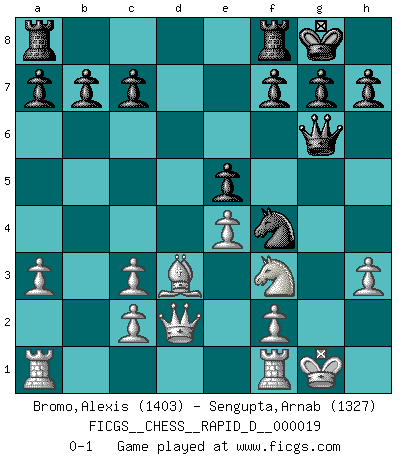 Last move : 0-1 2009 March 15 7:27:26 [Event "FICGS__CHESS__RAPID_D__000019"] [Site "FICGS"] [Date "2009.03.09"] [Round "1"] [White "Bromo,Alexis"] [Black "Sengupta,Arnab"] [Result "0-1"] [WhiteElo "1403"] [BlackElo "1327"] 1.e4 e5 2.Nf3 Nf6 3.Nc3 Bb4 4.d3 Nc6 5.a3 Bxc3+ 6.bxc3 d5 7.Bg5 dxe4 8.Bxf6 Qxf6 9.dxe4 O-O 10.Bd3 Ne7 11.h3 Ng6 12.Qd2 Nf4 13.O-O Bxh3 14.gxh3 Qg6+ 0-1 Petrov Three knights game Kingside Castling by player Black (move 9) Kingside Castling by player White (move 13) Player Black won this chess game. Follow this game move after move (download)A Chess game is a dialogue, a conversation between a player and his opponent. Each move by the opponent may contain threats or be a blunder, but a player cannot defend against threats or take advantage of blunders if he does not first ask himself: What is my opponent planning after each move ? (Bruce A. Moon) Ich habe die besten Aussichten, den ersten Preis zu gewinnen - denn jeder muss gegen Steinitz spielen, nur ich nicht! (Wilhelm Steinitz) Bendita sea la memoria de aquel que dio al mundo este juego inmortal. (A. G. Gardiner) Les Cavaliers se révèlent fort utiles dans les positions fermées. D'habitude, les Fous sont un peu plus forts que les Cavaliers dans les positions ouvertes. Qu'on le veuille ou non, il restera toujours des exceptions ! There will be no order, only chaos. (Sol Robeson in Pi by Darren Aronofsky)