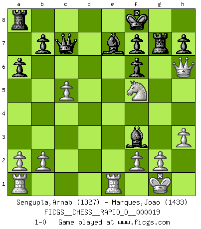 Last move : 1-0 2009 March 31 15:30:44 [Event "FICGS__CHESS__RAPID_D__000019"] [Site "FICGS"] [Date "2009.03.09"] [Round "1"] [White "Sengupta,Arnab"] [Black "Marques,Joao"] [Result "1-0"] [WhiteElo "1327"] [BlackElo "1433"] 1.d4 d5 2.c4 Nf6 3.Nf3 e6 4.Nc3 c5 5.cxd5 exd5 6.Bg5 Be6 7.e4 dxe4 8.Nxe4 Be7 9.Bb5+ Nbd7 10.Bxf6 gxf6 11.O-O a6 12.Bxd7+ Bxd7 13.dxc5 Rg8 14.Re1 Kf8 15.Qd2 Qc7 16.Qh6+ Rg7 17.Ng3 Bg4 18.h3 Bxf3 19.Nf5 1-0 QGD : Marshall defense Kingside Castling by player White (move 11) Player White won this chess game. Follow this game move after move (download)In the perfect Chess combination as in a first-rate short story, the whole plot and counter-plot should lead up to a striking finale, the interest not being allayed until the very last moment. (Yates and Winter) Ich hatte meine größten Erfolge, als ich 47 Jahre alt war. Kasparow war noch nicht mal 42 und hat das Schach schon im Stich gelassen. (Viktor Kortschnoi) Bobby es la celebridad menos entendida y malinterpretada que camina el la faz de esta tierra. (Yasser Seirawan) Mon pion favori sur ma case favorite ! Bronstein en parlant d'un coup de pion en h5 quand il avait les Noirs. I find your interest interesting. (Gregory House, House M.D.)