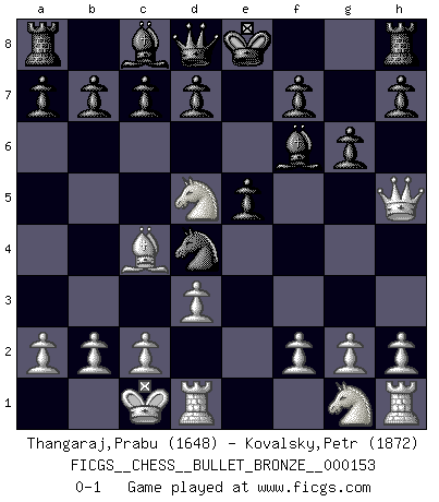 Last move : 0-1 2009 December 4 23:50:9 [Event "FICGS__CHESS__BULLET_BRONZE__000153"] [Site "FICGS"] [Date "2009.12.04"] [Round "1"] [White "Thangaraj,Prabu"] [Black "Kovalsky,Petr"] [Result "0-1"] [WhiteElo "1648"] [BlackElo "1872"] 1.e4 e5 2.Bc4 Nf6 3.Nc3 Nc6 4.Nd5 Nxe4 5.d3 Nf6 6.Bg5 Be7 7.Bxf6 Bxf6 8.Qh5 Nd4 9.O-O-O g6 0-1 This chess game has been lost on time (started : 2009.12.04 23:34:4) Bishop's Opening : Berlin defense Queenside Castling by player White (move 9) Player Black won this chess game. Follow this game move after move (download)The essence of Chess is thinking about what Chess is. (David Bronstein) Die Neutralität betrachte ich als eine schwere Krankheit. (Viktor Kortschnoi) Un juego de Ajedrez es un dialogo, una conversación entre un jugador y su oponente. Cada movimiento del oponente puede contener amenazas o tropiezos, pero un jugador no se puede defender de las amenazas o tomar ventaja de los tropiezos si es que no se pregunta a sí mismo: ¿Que es lo que mi oponente va a hacer después de cada movida?. (Bruce A. Moon) Une platitude souvent récitée à propos des Echecs est qu'une des choses les plus difficiles à réaliser est de gagner une position gagnante. Cela ne manque pas de sens mais, pour ma part, j'ai toujours trouvé plus difficile de gagner une position perdante. (Tim Krabbe) The only thing that overcomes hard luck is hard work. (Harry Golden)