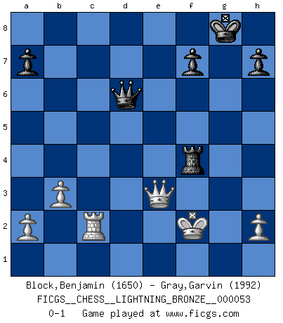 Last move : 0-1 2009 June 13 20:0:18 [Event "FICGS__CHESS__LIGHTNING_BRONZE__000053"] [Site "FICGS"] [Date "2009.06.13"] [Round "1"] [White "Block,Benjamin"] [Black "Gray,Garvin"] [Result "0-1"] [WhiteElo "1650"] [BlackElo "1992"] 1.e4 c5 2.Nf3 d6 3.d4 cxd4 4.Nxd4 Nf6 5.Nc3 g6 6.Be3 Bg7 7.f3 O-O 8.Qd2 Nc6 9.O-O-O d5 10.exd5 Nxd5 11.Nxc6 bxc6 12.Nxd5 cxd5 13.Qxd5 Qc7 14.Qc5 Qb7 15.Qa3 Bf5 16.Bd3 Rab8 17.b3 Qc6 18.Qa5 Qf6 19.Bxf5 Qb2+ 20.Kd2 gxf5 21.Ke2 Rfc8 22.Rc1 Rxc2+ 23.Rxc2 Qxc2+ 24.Qd2 Qc7 25.Bf4 e5 26.Rc1 Qe7 27.Be3 Rd8 28.Qc2 e4 29.fxe4 fxe4 30.Qc7 Qf6 31.Rc6 Qb2+ 32.Rc2 Qf6 33.Qf4 Qa6+ 34.Kf2 Rd6 35.Qxe4 Rf6+ 36.Bf4 Bh6 37.g3 Qd6 38.Qe3 Bxf4 39.gxf4 Rxf4+ 0-1 This chess game has been lost on time (started : 2009.06.13 10:39:31) Sicilian : Dragon, Yugoslav attack, 7...O-O Kingside Castling by player Black (move 7) Queenside Castling by player White (move 9) Player Black won this chess game. Follow this game move after move (download)Strategy requires thought, tactics require observation. (Max Euwe) Über die Verhaftung Bobby Fischers: Warum es die Bush-Administration für nötig befindet einen 61 Jahre alten Mann zu hetzten, der für niemanden ausser sich selbste eine Gefahr darstellt ist ein Rätsel. (Nigel Short) En la vida, como en el Ajedrez, los Peones propios obstruyen nuestro camino. La gran fortuna de un hombre, su comodidad, placer, hijos, libros, que deberían ayudarle a ganar, con mucha frecuencia lo ponen en Jaque Mate. (Charles Buxton) La tactique est l'élément le plus important du milieu de jeu. (Siegbert Tarrasch) The best weapon against an enemy is another enemy. (Friedrich Nietzsche)