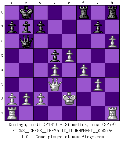 Last move : 1-0 2009 April 24 0:40:11 [Event "FICGS__CHESS__THEMATIC_TOURNAMENT__000076"] [Site "FICGS"] [Date "2009.03.09"] [Round "1"] [White "Domingo,Jordi"] [Black "Simmelink,Joop"] [Result "1-0"] [WhiteElo "2181"] [BlackElo "2279"] 1.e4 e5 2.Nf3 f5 3.Nxe5 Nc6 4.d4 Qe7 5.Nc3 Nf6 6.Nxc6 dxc6 7.e5 Nd5 8.Nxd5 cxd5 9.Qf3 Be6 10.Bd3 Qf7 11.h4 Be7 12.Bg5 Bxg5 13.hxg5 Qe7 14.Qf4 Qb4+ 15.Ke2 O-O-O 16.Bxf5 Bxf5 17.Qxf5+ Kb8 18.Qd3 Rdf8 19.g3 Qb6 20.f4 h6 21.gxh6 1-0 Latvian : Fraser defense Queenside Castling by player Black (move 15) Player White won this chess game. Follow this game move after move (download)Many have become Chess Masters, no one has become the Master of Chess. (Siegbert Tarrasch) Die Idee von Capablanca, Schach als Fach in den Schulen zu lehren, ist großartig. (Fidel Castro) Debemos de asegurarnos de que el Ajedrez no se convierta en un lenguaje muerto, muy interesante, pero solo para un grupo muy pequeño. (Sytze Faber) D'abord les bases : Jouez et étudiez, puis étudiez et jouez, ensuite jouez et étudiez, puis étudiez et jouez. Deuxièmement : Donnez toujours le meilleur de vous-même ! (Ken Smith) If you have any trouble condescending, find a Unix user to show you how it's done. (Scott Adams)