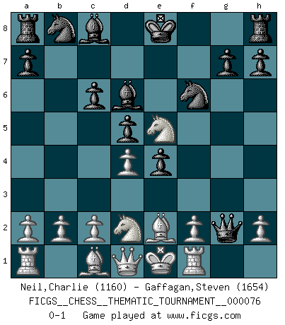 Last move : 0-1 2009 April 16 15:16:46 [Event "FICGS__CHESS__THEMATIC_TOURNAMENT__000076"] [Site "FICGS"] [Date "2009.03.09"] [Round "1"] [White "Neil,Charlie"] [Black "Gaffagan,Steven"] [Result "0-1"] [WhiteElo "1160"] [BlackElo "1654"] 1.e4 e5 2.Nf3 f5 3.Bc4 b5 4.Bxb5 fxe4 5.Nxe5 Qg5 6.d4 Qxg2 7.Rf1 c6 8.Bc4 d5 9.Be2 Nf6 10.Nd2 Bd6 0-1 Latvian gambit, 3.Bc4 Player Black won this chess game. Follow this game move after move (download)There are two classes of men; those who are content to yield to circumstances and who play whist; those who aim to control circumstances, and who play Chess. (Mortimer Collins) Ein unbeabsichtigtes Patt ist der Gipfel der Dummheit. (Anonymous) Una buena ofensiva y una buena defensa, comienzan ambas con un buen desarrollo. (Bruce A. Moon) Ce qui caractérise les parties de combat, c'est que si le défenseur a constamment de difficiles problèmes à résoudre, l'attaquant doit chercher sans relâche de nouvelles possibilités d'attaque. (Koblentz) Lamb in skin of tiger, still fears the wolf. (Chinese proverb)