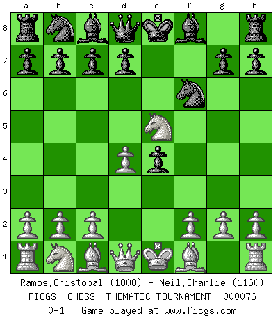 Last move : 0-1 2009 April 19 15:19:12 [Event "FICGS__CHESS__THEMATIC_TOURNAMENT__000076"] [Site "FICGS"] [Date "2009.03.09"] [Round "1"] [White "Ramos,Cristobal"] [Black "Neil,Charlie"] [Result "0-1"] [WhiteElo "1800"] [BlackElo "1160"] 1.e4 e5 2.Nf3 f5 3.d4 fxe4 4.Nxe5 Nf6 0-1 This chess game has been lost on time (started : 2009.03.09 21:58:3) Latvian counter-gambit Player Black won this chess game. Follow this game move after move (download)Could we look into the head of a Chess player, we should see there a whole world of feelings, images, ideas, emotion and passion. (Alfred Binet) Kombinieren und Schwarzhandel gehören verboten. (Savielly Grigorievitsch Tartakower) ¡Examina movidas que hagan daño! Un buen ojo for movidas desvastantes es mucho mas importante que el conocimiento de principios estratégicos. (Purdy) Même si l'adversaire joue le coup analysé précédemment, recommencez l'analyse en voyant la nouvelle position. Première règle de Blumenfeld Is not life a hundred times too short to bore ourselves ? (Friedrich Nietzsche)