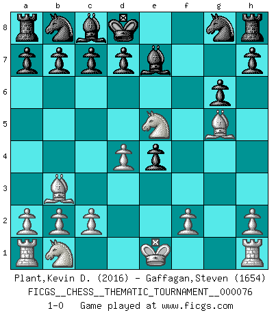 Last move : 1-0 2009 May 14 17:52:7 [Event "FICGS__CHESS__THEMATIC_TOURNAMENT__000076"] [Site "FICGS"] [Date "2009.03.09"] [Round "1"] [White "Plant,Kevin D."] [Black "Gaffagan,Steven"] [Result "1-0"] [WhiteElo "2016"] [BlackElo "1654"] 1.e4 e5 2.Nf3 f5 3.Bc4 fxe4 4.Nxe5 Qg5 5.d4 Qxg2 6.Qh5+ g6 7.Bf7+ Kd8 8.Qg5+ Qxg5 9.Bxg5+ Be7 10.Bb3 1-0 This chess game has been lost on time (started : 2009.03.09 21:58:3) Latvian gambit, 3.Bc4 Player White won this chess game. Follow this game move after move (download)What would Chess be without silly mistakes ? (Kurt Richter) Wenn ich einen Club besuche, sind die Spieler stumm vor Staunen. (José Raúl Capablanca) Combinaciones deslumbrantes son para la mayoría, mover madera es para los pocos. (Georg Kieninger) Il vaut mieux sacrifier les pièces de l'adversaire. (Xavier Tartacover) Watch your thoughts; they become words. Watch your words; they become actions. Watch your actions; they become habits. Watch your habits; they become character. Watch your character; it becomes your destiny. (Frank Outlaw)