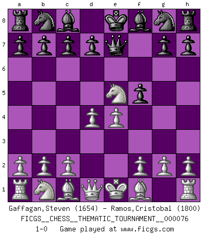 Last move : 1-0 2009 May 4 16:49:36 [Event "FICGS__CHESS__THEMATIC_TOURNAMENT__000076"] [Site "FICGS"] [Date "2009.03.09"] [Round "1"] [White "Gaffagan,Steven"] [Black "Ramos,Cristobal"] [Result "1-0"] [WhiteElo "1654"] [BlackElo "1800"] 1.e4 e5 2.Nf3 f5 3.Nxe5 Qe7 4.d4 1-0 This chess game has been lost on time (started : 2009.03.09 21:58:3) Latvian counter-gambit Player White won this chess game. Follow this game move after move (download)Combinations have always been the most intriguing aspect of Chess. The masters look for them, the public applauds them, the critics praise them. It is because combinations are possible that Chess is more than a lifeless mathematical exercise. They are the poetry of the game; they are to Chess what melody is to music. They represent the triumph of mind over matter. (Reuben Fine) Sie führen leise Selbstgespräche, schlürfen lautstark ihre Getränke, schmatzen hörbar beim Essen, blasen ihrem Gegenüber Rauch in die Augen, niesen ihm ins Gesicht, starren ihn unverwandt an, bis er sich unter ihren Blicken windet, rutschen ständig auf ihrem Stuhl hin und her, rülpsen und bohren in der Nase. (Anonymous) Un juego de Ajedrez es un dialogo, una conversación entre un jugador y su oponente. Cada movimiento del oponente puede contener amenazas o tropiezos, pero un jugador no se puede defender de las amenazas o tomar ventaja de los tropiezos si es que no se pregunta a sí mismo: ¿Que es lo que mi oponente va a hacer después de cada movida?. (Bruce A. Moon) Les Echecs mettent en conflit, non pas deux intelligences, mais deux volontés. (Lasker) Home computers are being called upon to perform many new functions, including the consumption of homework formerly eaten by the dog. (Doug Larson)