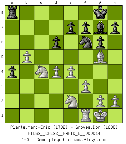 Last move : 1-0 2006 September 23 9:41:37 [Event "FICGS__CHESS__RAPID_B__000014"] [Site "FICGS"] [Date "2006.09.04"] [Round "1"] [White "Plante,Marc-Eric"] [Black "Groves,Don"] [Result "1-0"] [WhiteElo "1782"] [BlackElo "1688"] 1.e4 d6 2.d4 g6 3.Nc3 Bg7 4.Be3 a6 5.Qd2 b5 6.a4 b4 7.Nd1 a5 8.c3 Nf6 9.f3 bxc3 10.bxc3 O-O 11.Bd3 c5 12.Ne2 Nbd7 13.O-O Qc7 14.Rb1 Nb6 15.Bb5 Bd7 16.Qa2 Bxb5 17.Rxb5 cxd4 18.cxd4 Qc4 19.Qxc4 Nxc4 20.Bg5 Rfb8 21.Ne3 Rxb5 22.axb5 a4 23.Nxc4 1-0 King's pawn Opening Kingside Castling by player Black (move 10) Kingside Castling by player White (move 13) Player White won this chess game. Follow this game move after move (download)When you don't know what to play, wait for an idea to come into your opponent's mind. You may be sure that idea will be wrong. (Siegbert Tarrasch) Ich hatte Angst gegen einen russischen Großmeister zu verlieren, und er befürchtete gegen einen kleinen Jungen zu verlieren. (über ein Remis gegen Juri Awerbach). (Robert James Fischer) El Ajedrez es despiadado: debes de estar preparado para matar gente. (Nigel Short) Assurément je connaissais par expérience le mystérieux attrait de ce jeu royal, le seul entre tous les jeux inventés par les hommes qui échappe souverainement à la tyrannie du hasard, le seul où l'on ne doive sa victoire qu'à son intelligence ou plutôt à une certaine forme d'intelligence. Mais n'est-ce pas déjà le limiter injurieusement que d'appeler les échecs un jeu ? N'est-ce pas une science, un art ou quelque chose qui, comme le cercueil de Mahomet entre ciel et terre, est suspendu entre l'un et l'autre, et qui réunit un nombre incroyable de contraires ? [...] C'est une pensée qui ne mène à rien, une mathématique qui n'établit rien, un art qui ne laisse pas d'uvre, une architecture sans matière; et il l'a prouvé néanmoins qu'il était plus durable, à sa manière, que les livres ou que tout autre monument, ce jeu unique qui appartient à tous les peuples et à tous les temps, et dont personne ne sait quel dieu en fit don à la terre pour tuer l'ennui, pour aiguiser l'esprit et stimuler l'âme. Où commence-t-il, où finit-il ? (Stefan Zweig) Good luck. You're gonna need it. (Han Solo in Star Wars ep.6)