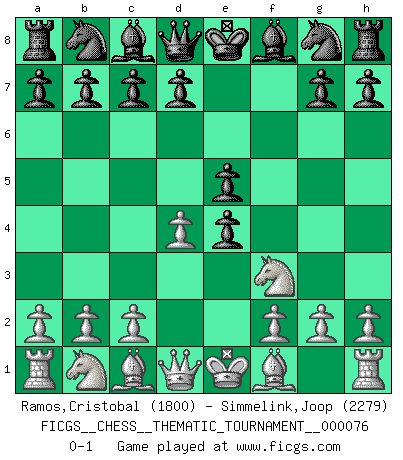 Last move : 0-1 2009 May 1 4:36:26 [Event "FICGS__CHESS__THEMATIC_TOURNAMENT__000076"] [Site "FICGS"] [Date "2009.03.09"] [Round "1"] [White "Ramos,Cristobal"] [Black "Simmelink,Joop"] [Result "0-1"] [WhiteElo "1800"] [BlackElo "2279"] 1.e4 e5 2.Nf3 f5 3.d4 fxe4 0-1 This chess game has been lost on time (started : 2009.03.09 21:58:3) Latvian counter-gambit Player Black won this chess game. Follow this game move after move (download)My style is somewhere between that of Tal and Petrosian. (Reshevsky) Die Partien sind immer verschieden, die Interviews immer die gleichen. (Garry Kasparov) Cuando tu casa esta en llamas, no puedes ser molestado por tus vecinos. O, como decinos en Ajedrez, si tu Rey esta bajo ataque, no te preocupa perder un Peón del lado de la Reina. (Gary Kasparov) Mon pion favori sur ma case favorite ! Bronstein en parlant d'un coup de pion en h5 quand il avait les Noirs. I take risks, sometimes patients die, but not taking risks causes more patients to die. So I guess my biggest problem is I've been cursed with the ability to do the math. (Gregory House, House M.D.)