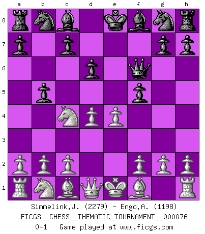 Last move : 0-1 2009 April 23 19:0:50 [Event "FICGS__CHESS__THEMATIC_TOURNAMENT__000076"] [Site "FICGS"] [Date "2009.03.09"] [Round "1"] [White "Simmelink,Joop"] [Black "Engo,Arne Sigvald"] [Result "0-1"] [WhiteElo "2279"] [BlackElo "1198"] 1.e4 e5 2.Nf3 f5 3.Nxe5 Qf6 4.d4 d6 5.Nc4 b5 0-1 Latvian counter-gambit Player Black won this chess game. Follow this game move after move (download)The game of chess is the touchstone of the intellect. (Goethe) Ich war zu klein für die Schach-Schülermannschaft! (Woody Allen) El estómago es una parte esencial del maestro de Ajedrez. (Bent Larsen) Les échecs sont utiles à l'exercice de la faculté de penser et à celle de l'imagination. Car nous devons posséder une méthode élaborée pour atteindre des buts partout où nous devons conduire notre raison. (Leibnitz) The various flowers seem good to different people. (Chinese proverb)