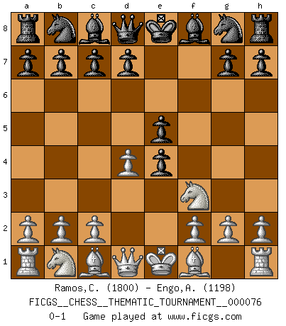 Last move : 0-1 2009 April 20 15:38:31 [Event "FICGS__CHESS__THEMATIC_TOURNAMENT__000076"] [Site "FICGS"] [Date "2009.03.09"] [Round "1"] [White "Ramos,Cristobal"] [Black "Engo,Arne Sigvald"] [Result "0-1"] [WhiteElo "1800"] [BlackElo "1198"] 1.e4 e5 2.Nf3 f5 3.d4 fxe4 0-1 This chess game has been lost on time (started : 2009.03.09 21:58:3) Latvian counter-gambit Player Black won this chess game. Follow this game move after move (download)The tactician knows what to do when there is something to do; whereas the strategian knows what to do when there is nothing to do. (Gerald Abrahams) Das Schachspiel übertrifft alle anderen Spiele so weit wie der Chimborasso einen Misthaufen. (Arthur Schopenhauer) En un gambito tu regalas un Peón por el bién de tomar un juego perdido. (Samuel Standige Boden) Ne tendez aucun piège pour le plaisir ! Ne jouez rien dans l'espoir que l'adversaire réagisse de façon stupide ! Prenez toujours pour acquis que l'adversaire va trouver le meilleur coup ! Ne jouez jamais de coup dans l'espoir que l'adversaire ne voie pas la menace ! Chacun de vos coups doit améliorer la position d'une façon ou d'une autre. Somewhere in the world there is an epigram for every dilemma. (Hendrik Willem van Loon)