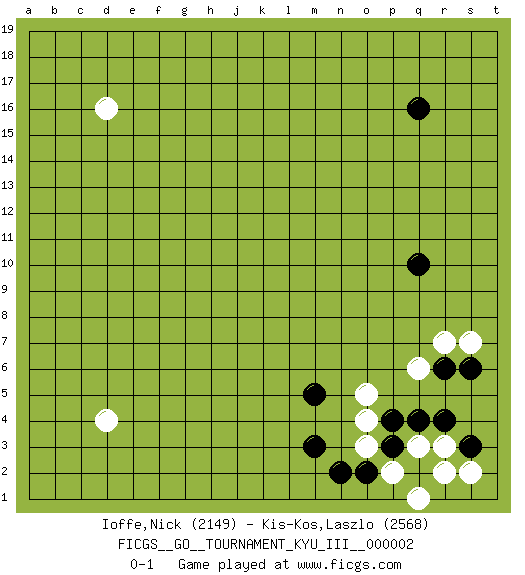 Last move : 0-1 2009 May 1 16:33:50 [Event "FICGS__GO__TOURNAMENT_KYU_III__000002"] [Site "FICGS"] [Date "2009.03.10"] [Round "1"] [Black "Ioffe,Nick"] [White "Kis-Kos,Laszlo"] [Result "0-1"] [Rating 1 "2149"] [Rating 2 "2568"] 1.q16 d4 2.q4 d16 3.q10 o3 4.m3 r3 5.r4 q3 6.p4 o4 7.p3 p2 8.s3 s2 9.q2 r2 10.o2 q1 11.n2 o5 12.m5 q6 13.r6 r7 14.s6 s7 0-1 Here are the names of the openings (joseki) played in the four corners : Corner q4 : q4 o3 Hoshi (Hwajeom, Seongjeom, Xingwei`) 4-4 Point. The star or hoshi (4-4) point, emphasizing influence at the potential expense of territory. Ikken Kakari (Hankan Keolch'im, Yi Gua`jiao~, 1-Space Low Approach). White 2 is the standard approach move to the 4-4. Player White won this Go (weiqi, baduk) game. Follow this game move after move (download)Don't overlook the edge of the board. (Anonymous) Every vice is only an exaggeration of a necessary and virtuous function. (Ralph Waldo Emerson, Journals 1936)
