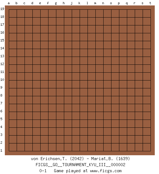 Last move : 0-1 2009 April 9 14:23:55 [Event "FICGS__GO__TOURNAMENT_KYU_III__000002"] [Site "FICGS"] [Date "2009.03.10"] [Round "1"] [Black "von Erichsen,Thore"] [White "Mariat,Benoit"] [Result "0-1"] [Rating 1 "2042"] [Rating 2 "1639"] 0-1 This go game has been lost on time (started : 2009.03.10 9:47:16) Here are the names of the openings (joseki) played in the four corners : Player White won this Go (weiqi, baduk) game. Follow this game move after move (download)The weak player fears ko, the strong player seeks it. (Bill Taylor) The only sure thing about luck is that it will change. (Wilson Mizner)
