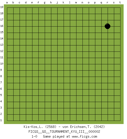 Last move : 1-0 2009 April 11 2:33:13 [Event "FICGS__GO__TOURNAMENT_KYU_III__000002"] [Site "FICGS"] [Date "2009.03.10"] [Round "1"] [Black "Kis-Kos,Laszlo"] [White "von Erichsen,Thore"] [Result "1-0"] [Rating 1 "2568"] [Rating 2 "2042"] 1.r16 1-0 This go game has been lost on time (started : 2009.03.10 9:47:16) Here are the names of the openings (joseki) played in the four corners : Player Black won this Go (weiqi, baduk) game. Follow this game move after move (download)When your opponent has two weak groups, attack them both at once. (Anonymous) I can't decide which is riskier; taking crazy risks, or taking advice on crazy risks from a crazy risk taker. (Gregory House in House M.D.)