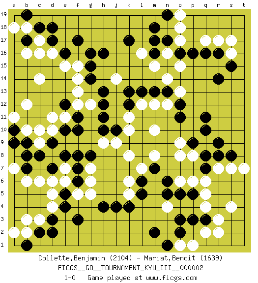 Last move : 1-0 2009 August 16 0:46:52 [Event "FICGS__GO__TOURNAMENT_KYU_III__000002"] [Site "FICGS"] [Date "2009.03.10"] [Round "1"] [Black "Collette,Benjamin"] [White "Mariat,Benoit"] [Result "1-0"] [Rating 1 "2104"] [Rating 2 "1639"] 1.q16 d4 2.q3 d16 3.f3 q5 4.q8 n4 5.p5 p6 6.o5 q4 7.o3 r3 8.p3 o6 9.n5 s4 10.j4 c6 11.q11 o17 12.m17 r17 13.r16 q17 14.p16 o18 15.n15 d10 16.f17 c14 17.d18 c17 18.h16 o9 19.n6 p8 20.q7 q6 21.d2 c3 22.c2 b2 23.d3 b3 24.c18 g5 25.e4 d5 26.f6 g6 27.f7 g7 28.f8 f5 29.e5 e6 30.g8 k6 31.h4 k8 32.d7 d6 33.d9 c9 34.c8 c10 35.e10 e11 36.f11 f12 37.e12 d11 38.f10 g12 39.h11 f15 40.g14 f14 41.o11 k11 42.j10 k10 43.h12 s16 44.s15 s17 45.r14 r7 46.r8 q9 47.r9 s7 48.q10 r2 49.l5 k5 50.k4 j9 51.h13 f13 52.b9 b10 53.b7 b6 54.a10 a11 55.a9 b12 56.b17 b16 57.d17 c16 58.m18 b18 59.b19 a18 60.k13 o1 61.o2 p1 62.n1 q2 63.m2 h9 64.h10 a7 65.b8 l12 66.l13 m12 67.n13 n12 68.o12 m10 69.s8 e7 70.e8 t7 71.p9 o8 72.n19 o19 73.b1 a2 74.l6 l7 75.m7 m8 76.e16 e15 77.g16 n16 78.m16 o15 79.o16 n14 80.m13 m15 81.n17 l16 82.k17 j14 83.g15 o13 84.k12 1-0 Here are the names of the openings (joseki) played in the four corners : Corner d4 : d4 f3 Hoshi (Hwajeom, Seongjeom, Xingwei`) 4-4 Point. The star or hoshi (4-4) point, emphasizing influence at the potential expense of territory. Ikken Kakari (Hankan Keolch'im, Yi Gua`jiao~, 1-Space Low Approach). Black 2 is the standard approach move to the 4-4. Corner q4 : q3 q5 Komoku (Somok, Xiao~mu`) 3-4 Point. The komoku (3-4) point is the traditional corner enclosure move.. Ikken Takagakari (Hankan Nop'dakeolch'im, Yi Gaogua`jiao~, 1-Space High Approach). The 5-4 approach move has become more popular in modern times, as modern Go emphasizes speed and influence. Corner d16 : d16 f17 Hoshi (Hwajeom, Seongjeom, Xingwei`) 4-4 Point. The star or hoshi (4-4) point, emphasizing influence at the potential expense of territory. Ikken Kakari (Hankan Keolch'im, Yi Gua`jiao~, 1-Space Low Approach). Black 2 is the standard approach move to the 4-4. Player Black won this Go (weiqi, baduk) game. Follow this game move after move (download)Empty triangles are bad. (Anonymous) He is a liar. I just don't know what the lie is yet. (Horatio Caine, C.S.I. Miami)