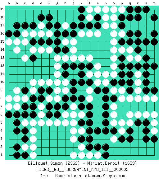 Last move : 1-0 2009 August 26 23:48:8 [Event "FICGS__GO__TOURNAMENT_KYU_III__000002"] [Site "FICGS"] [Date "2009.03.10"] [Round "1"] [Black "Billouet,Simon"] [White "Mariat,Benoit"] [Result "1-0"] [Rating 1 "2362"] [Rating 2 "1639"] 1.r16 d4 2.q3 d16 3.f17 p16 4.c14 d14 5.d13 e14 6.c17 c15 7.d17 c13 8.p15 r17 9.q16 q17 10.p17 o16 11.p18 s16 12.s17 s18 13.r18 t17 14.q18 s17 15.r14 n17 16.s15 o15 17.s19 p14 18.r12 r13 19.s13 q13 20.s11 q6 21.o4 k4 22.c6 c8 23.c3 d3 24.c4 d5 25.b6 e7 26.m4 r9 27.p11 o9 28.r5 o11 29.p10 p9 30.o10 n10 31.n9 n11 32.n8 o7 33.n7 o6 34.n6 r6 35.s5 s6 36.k3 j4 37.l3 h17 38.f15 f14 39.g15 h15 40.g14 e16 41.f18 j13 42.g17 g13 43.h14 j14 44.h16 j15 45.j16 k16 46.j17 j3 47.k8 h9 48.h8 g8 49.h7 h5 50.j9 h10 51.b8 b9 52.c9 b7 53.c7 a8 54.d8 b8 55.d7 d9 56.e9 d10 57.e8 e10 58.k17 l16 59.p12 r10 60.q12 q14 61.r15 c2 62.b2 d2 63.g7 e6 64.b1 k2 65.l2 j1 66.b16 b15 67.m18 q5 68.q4 n18 69.m17 m16 70.t9 s8 71.k11 l9 72.k10 l8 73.l7 l11 74.k12 l13 75.l12 m12 76.l10 o12 77.p13 o13 78.q15 o14 79.t15 l1 80.m2 m1 81.n1 k1 82.n2 t5 83.s4 t4 84.t3 t6 85.s3 g9 86.c1 d1 87.g6 g5 88.f6 f5 89.h11 g11 90.h12 g12 91.f9 f10 92.a6 l18 93.l17 c5 94.b5 e17 95.e18 m19 96.k18 k6 97.l6 o5 98.n5 m10 99.m9 t8 100.s10 k13 101.k7 j6 102.o8 p8 103.q10 r11 104.q9 q8 105.s9 p4 106.p3 p5 107.d6 j7 108.j8 f8 109.f7 e5 110.l5 a15 111.a16 c16 112.b17 l19 113.k19 n19 114.e15 h13 115.d15 f16 116.g16 b14 117.k5 p19 118.j10 g10 119.j12 t19 120.t18 s12 121.t12 t19 122.r19 o17 123.t18 o3 124.n4 t19 125.t16 m11 126.b4 j5 127.l4 r8 128.s12 a7 129.q11 h6 130.t18 o19 131.q19 o18 132.pass 1-0 Here are the names of the openings (joseki) played in the four corners : Corner d16 : d16 f17 Hoshi (Hwajeom, Seongjeom, Xingwei`) 4-4 Point. The star or hoshi (4-4) point, emphasizing influence at the potential expense of territory. Ikken Kakari (Hankan Keolch'im, Yi Gua`jiao~, 1-Space Low Approach). Black 2 is the standard approach move to the 4-4. Corner q16 : r16 p16 Komoku (Somok, Xiao~mu`) 3-4 Point. The komoku (3-4) point is the traditional corner enclosure move.. Ikken Takagakari (Hankan Nop'dakeolch'im, Yi Gaogua`jiao~, 1-Space High Approach). The 5-4 approach move has become more popular in modern times, as modern Go emphasizes speed and influence. Corner q4 : q3 q6 Komoku (Somok, Xiao~mu`) 3-4 Point. The komoku (3-4) point is the traditional corner enclosure move.. Nikken Takagakari (Dukan Nop'dakeolch'im, E`r Gaojia, 2-Space High Approch). The great master Honinbo Shuei (1852-1906) favored the two-space high (niken taka-gakari) approach, especially in two stone handicap games. This approach move was very popular in the 1910s. Wu Qingyuan = Go Seigen frequently played this way, considering it a good "whole board" approach. In recent years, O Rissei has often used the two-space high approach. Corner d4 : d4 c6 Hoshi (Hwajeom, Seongjeom, Xingwei`) 4-4 Point. The star or hoshi (4-4) point, emphasizing influence at the potential expense of territory. Ikken Kakari (Hankan Keolch'im, Yi Gua`jiao~, 1-Space Low Approach). Black 2 is the standard approach move to the 4-4. Player Black won this Go (weiqi, baduk) game. Follow this game move after move (download)Don't make territory near thickness. (Anonymous) It's not a bug - it's an undocumented feature. (Anonymous)