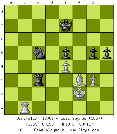 Last move : 0-1 2009 June 12 5:22:50 [Event "FICGS__CHESS__RAPID_B__000117"] [Site "FICGS"] [Date "2009.03.10"] [Round "1"] [White "Dum,Felix"] [Black "Lois,Spyros"] [Result "0-1"] [WhiteElo "1800"] [BlackElo "1857"] 1.e4 c5 2.Nf3 Nc6 3.d4 cxd4 4.Nxd4 Nf6 5.Nc3 e5 6.Ndb5 d6 7.Bg5 a6 8.Na3 b5 9.Nd5 Be7 10.Bxf6 Bxf6 11.c3 O-O 12.Nc2 Bg5 13.Be2 Rb8 14.O-O g6 15.b3 Ne7 16.Nce3 Be6 17.a4 bxa4 18.Rxa4 Bxe3 19.fxe3 Bxd5 20.exd5 Qb6 21.Rf3 Qxb3 22.Qxb3 Rxb3 23.Rxa6 Nxd5 24.e4 Nf4 25.Bf1 Rc8 26.Rxd6 Rbxc3 27.Rxc3 Rxc3 28.g3 Ne6 29.Rd5 Nd4 30.Kf2 f6 31.Rd8+ Kg7 32.Rd7+ Kh6 33.h3 Ne6 34.Rd6 Rc2+ 35.Kg1 Nc5 36.Bg2 Kg7 37.Bf3 Rc3 38.Kf2 h5 39.h4 Kf7 40.Rb6 Ke7 41.Rb1 g5 42.hxg5 fxg5 0-1 Sicilian : Pelikan (Lasker/Sveshnikov) variation Kingside Castling by player Black (move 11) Kingside Castling by player White (move 14) Player Black won this chess game. Follow this game move after move (download)When your house is on fire, you can't be bothered with the neighbors. Or, as we say in Chess, if your King is under attack you don't worry about losing a Pawn on the Queen's side. (Gary Kasparov) Wenn du auf das Glück wartest, wird das Leben ziemlich langweilig. (Mikhail Nekhemyevich Tal) Los finales de Peón son del Ajedrez lo que el cesped es del Golf. (Cecil Purdy) Toute estimation doit être constamment réévaluée. (Jacob Estrin) Tree pose grows confidence. It roots me to this world. (Terri Guillemets)