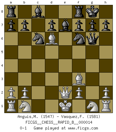 Last move : 0-1 2006 November 17 13:54:47 [Event "FICGS__CHESS__RAPID_B__000014"] [Site "FICGS"] [Date "2006.09.04"] [Round "1"] [White "Anguis,Miquel Angel"] [Black "Vasquez,Fernando"] [Result "0-1"] [WhiteElo "1547"] [BlackElo "1581"] 1.e4 e5 2.d4 exd4 3.c3 Qe7 4.cxd4 Qxe4+ 5.Be2 Qxg2 6.Bf3 Qg6 7.Qe2+ Be7 8.d5 Nf6 9.d6 cxd6 10.Bf4 Nc6 11.Bxd6 O-O 0-1 This chess game has been lost on time (started : 2006.09.04 21:16:24) Danish gambit Kingside Castling by player Black (move 11) Player Black won this chess game. Follow this game move after move (download)I have always a slight feeling of pity for the man who has no knowledge of Chess. (Siegbert Tarrasch) Ich bin stolz ein Bulgare zu sein. (Veselin Topalov) Una de estas pequeñas movidas modestas pudieran ser mas molestas a tu oponente que la amenaza mas grande. (Siegbert Tarrasch) Un footballeur joue avec ses pieds, parfois avec sa tête. Un joueur d'échecs ne joue qu'avec sa tête. Et quand il ne joue plus, il meurt. (Jacob Murray) If everyone is thinking alike, then somebody isn't thinking. (US General George S. Patton)