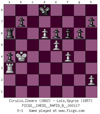 Last move : 0-1 2009 July 15 17:18:11 [Event "FICGS__CHESS__RAPID_B__000117"] [Site "FICGS"] [Date "2009.03.10"] [Round "1"] [White "Cirulis,Ilmars"] [Black "Lois,Spyros"] [Result "0-1"] [WhiteElo "1862"] [BlackElo "1857"] 1.d4 Nf6 2.c4 g6 3.Nc3 d5 4.cxd5 Nxd5 5.e4 Nxc3 6.bxc3 Bg7 7.Nf3 c5 8.Be3 Qa5 9.Qd2 O-O 10.Rc1 Nc6 11.d5 Rd8 12.Qb2 Ne5 13.Nxe5 Bxe5 14.f4 Bd4 15.Bxd4 cxd4 16.Kf2 dxc3 17.Qxc3 Qxa2+ 18.Be2 Qa4 19.Qd3 Qb4 20.Rb1 Qc5+ 21.Qe3 Qxe3+ 22.Kxe3 a5 23.Rhc1 a4 24.Rc3 e6 25.Bc4 Ra7 26.Ra3 Kf8 27.Rb4 Bd7 28.d6 Bc6 29.e5 Ra5 30.Kd4 Ke8 31.Rb6 Rda8 32.Bd3 Bxg2 33.Bb5+ Kd8 34.Kc5 Bc6 35.Kb4 Bxb5 36.Rxb5 Rxb5+ 37.Kxb5 Ra6 38.Kb4 f6 0-1 King's Indian defense, 3.Nc3 Kingside Castling by player Black (move 9) Player Black won this chess game. Follow this game move after move (download)You know you're going to lose. Even when I was ahead I knew I was going to lose. - On playing against Fischer. (Andrew Soltis) Ich moechte nie einem Club beitreten, der Leute wie mich als Mitglieder aufnimmt. (Woody Allen) No hay un Gran Maestro de Ajedrez que sea normal; solo se diferencían ellos por la magnitud de su locura. (Viktor Korchnoi) Vous savez, camarade Pachman, je n'éprouve pas de plaisir à être ministre, je jouerais plutôt aux échecs comme vous, ou alors ferais une révolution au Venezuela. (Che Guevara à Ludek Pachman, 'Checkmate in Prague', 1975) The message for business people contemplating their place in the cyberspace is simple and direct: get linked or get lost. (Vic Sussman and Kenan Pollack)