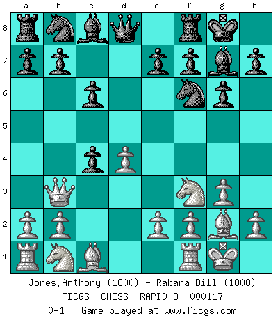Last move : 0-1 2009 April 20 3:31:32 [Event "FICGS__CHESS__RAPID_B__000117"] [Site "FICGS"] [Date "2009.03.10"] [Round "1"] [White "Jones,Anthony"] [Black "Rabara,Bill"] [Result "0-1"] [WhiteElo "1800"] [BlackElo "1800"] 1.Nf3 c6 2.g3 Nf6 3.Bg2 g6 4.O-O Bg7 5.c4 d5 6.Qb3 O-O 7.d4 dxc4 0-1 This chess game has been lost on time (started : 2009.03.10 18:35:10) Reti Opening Kingside Castling by player White (move 4) Kingside Castling by player Black (move 6) Player Black won this chess game. Follow this game move after move (download)Without error there can be no brilliancy. (Emanuel Lasker) Wenn es im Universum noch irgendwo intelligente Lebewesen gibt, dann kennen sie Go. (Emanuel Lasker) Aunque la mayoría de la gente disfruta observar las partidas de los grandes Maestros de ataque, algunos de los jugadores mas notables en la historia han sido los jugadores silenciosos posicionales. Lentamente ellos te aplastan despojandote de tu espacio, congestionando tus piezas y dejandote virtualmente sin nada que hacer. (Yasser Seirawan) Si le désir cupide (et stupide) de gagner est une inépuisable source de souffrance, une combinaison brillante sur l'échiquier est une découverte : le coquelicot qui s'épanouit lorsque apparaît la Voie Lactée. (Arrabal) Big Chess is a place for big hallucinations. (Thibault de Vassal)
